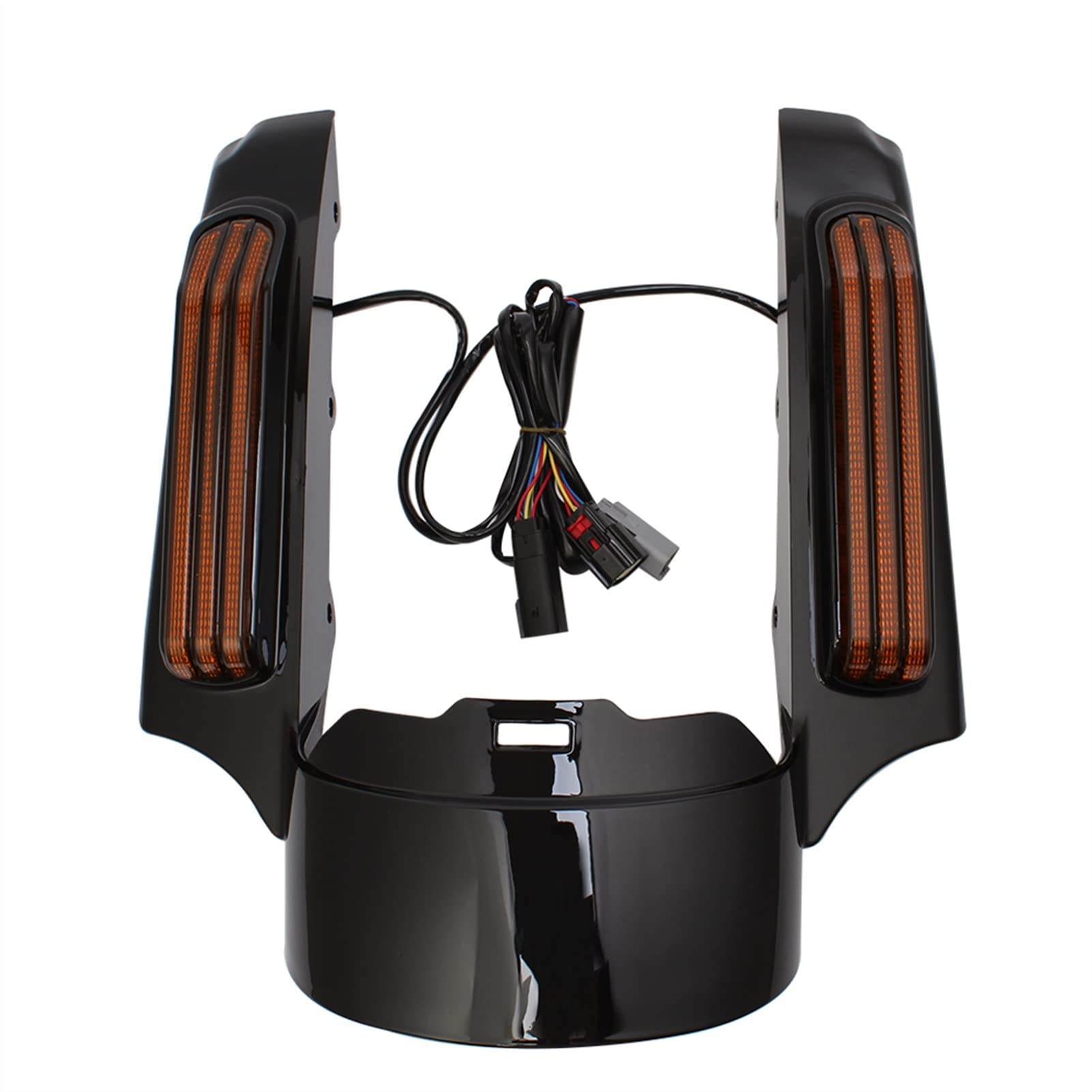 Upgrade deine Harley Touring mit diesem stylischen Heckkotflügel von HCmotorku! Die Verlängerung aus schwarzem ABS-Kunststoff ist nicht nur ein optisches Highlight, sondern auch super funktionell. Integriert sind moderne LED-Leuchten, die als Lauflicht, Bremslicht und Blinker fungieren - rot für Bremsen/Laufen, bernsteinfarben für die Blinker. Perfekt geeignet für Touring Modelle ab 2014 wie Road King, Street Glide, Electra Glide und Road Glide (außer FLHRC und CVO Modelle). Die Plug-and-Play-Installation macht den Einbau zum Kinderspiel - keine aufwändigen Verkabelungen nötig! Das glänzende schwarze Design mit schwarzer Linse passt perfekt zu deiner Harley. Im Lieferumfang ist der komplette Kotflügel mit LED-Licht enthalten. Wichtig: Nicht geeignet für Modelle mit Satteltaschenschutzschienen. So verpasst du deiner Maschine nicht nur einen frischen Look, sondern erhöhst auch die Sicherheit durch die hellen LED-Lichter!