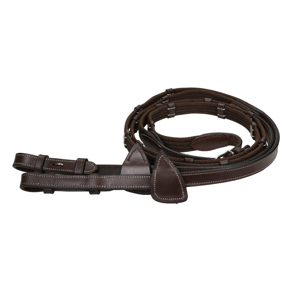 Hey Reiterfreunde! Diese QHP Gummizügel sind ein echter Game-Changer im Sattel. Mit den Noppen und Stopps rutscht nichts mehr aus den Händen - selbst bei nassen Fingern oder schwitzen Händen.\n\nEs gibt zwei Größen: 'Pony' mit 250 cm Gesamtlänge und 'Full' mit 280 cm. So findest du für jedes Pferd die passende Länge. Die Verarbeitung ist top - Gummi kombiniert mit Leder und rostfreiem Edelstahl.\n\nWas ich mega praktisch finde: Die Martingalstopper sind schon integriert. Musst du nicht extra kaufen und anbringen. Und die Blindschnallen machen das Handling super einfach.\n\nDie Zügel sind weich im Gummi, aber trotzdem stabil. Sie liegen gut in der Hand und geben dir das nötige Feedback vom Pferdemaul. Perfekt für Training, Ausritte oder auch den Unterricht.\n\nEgal ob du Anfänger bist oder schon Erfahrung hast - mit diesen Zügeln machst du nichts verkehrt. Sie geben Sicherheit und Kontrolle, ohne unangenehm zu sein.\n\nÜbrigens: Die braune Farbe sieht nicht nur klasse aus, sondern ist auch praktisch - sie verschmutzt nicht so schnell wie helle Zügel. Einfach abwischen und weiterreiten!