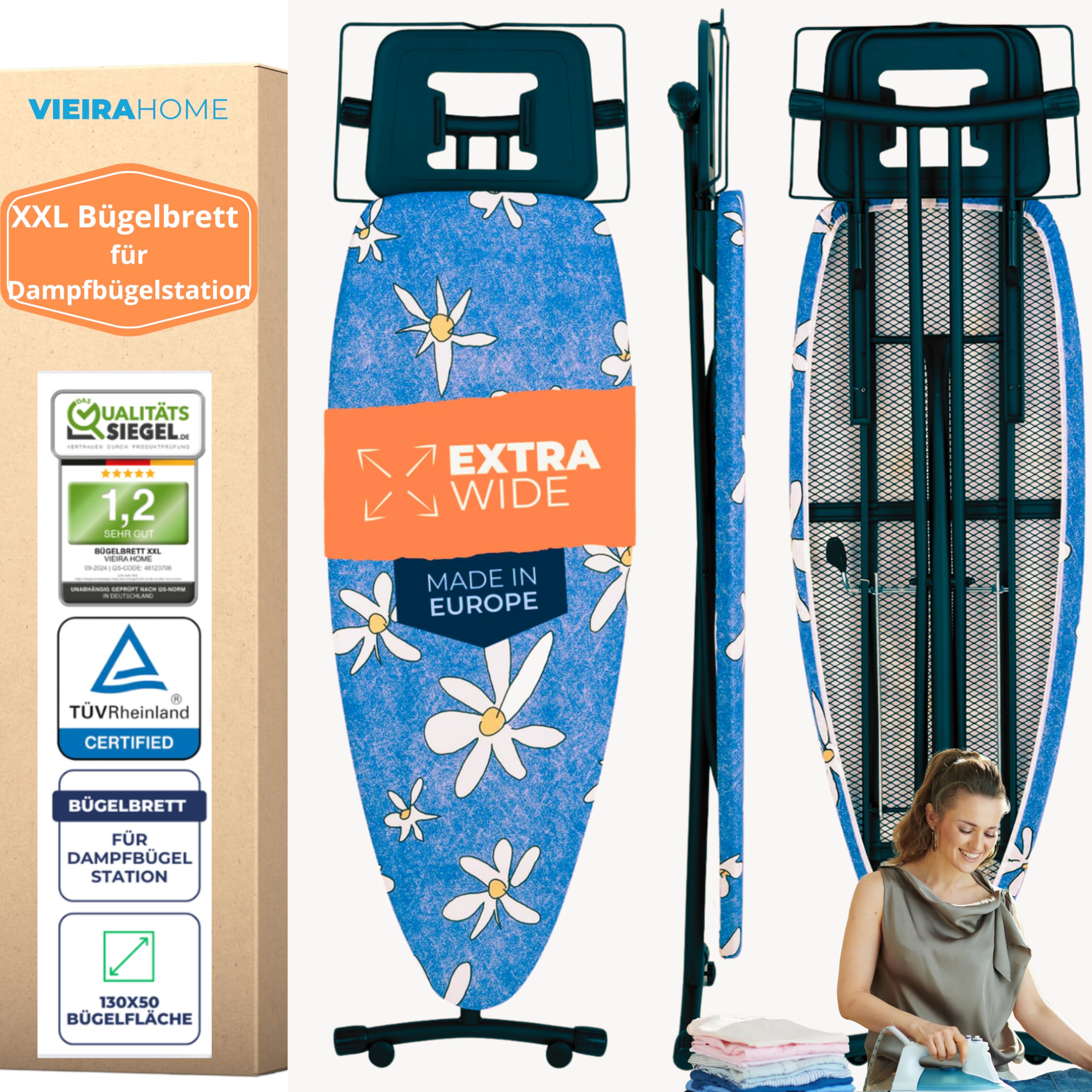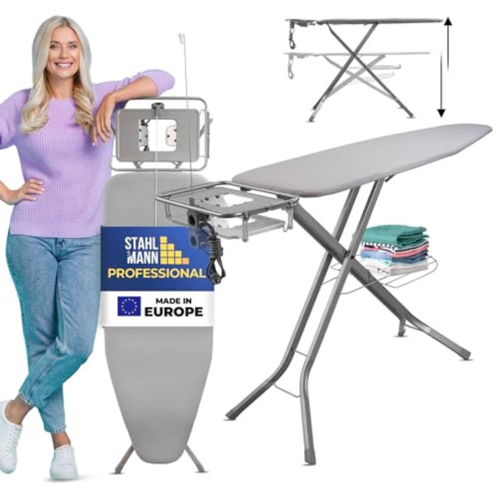 Das Premium-Bügelbrett für anspruchsvolle Bügler! Mit extra großer Fläche von 120x42 cm hast du genug Platz für Hemden, Hosen und sogar Bettwäsche. Besonders praktisch: Die integrierte Steckdose mit Kabel und Halterung - kein Kabelsalat mehr! Der inkludierte Turbobezug mit Hitzereflektion sorgt für gleichmäßige Wärmeverteilung und faltenfreies Bügeln. Noch mehr Komfort: Die höhenverstellbare Konstruktion bietet wackelfreien Stand auf jedem Boden, und die Ablage für frisch gebügelte Wäsche an den Füßen ist super praktisch. Hergestellt in Europa nach strengen Qualitätsstandards - das merkt man! Ob mit normalem Bügeleisen oder Dampfbügelstation - dieses Brett macht Bügeln zum Vergnügen. Einfach aufstellen, Stecker in die Dose und losbügeln! Endlich ein Bügelbrett, das wirklich alle Wünsche erfüllt. Für alle, die Wert auf Qualität und Komfort legen!