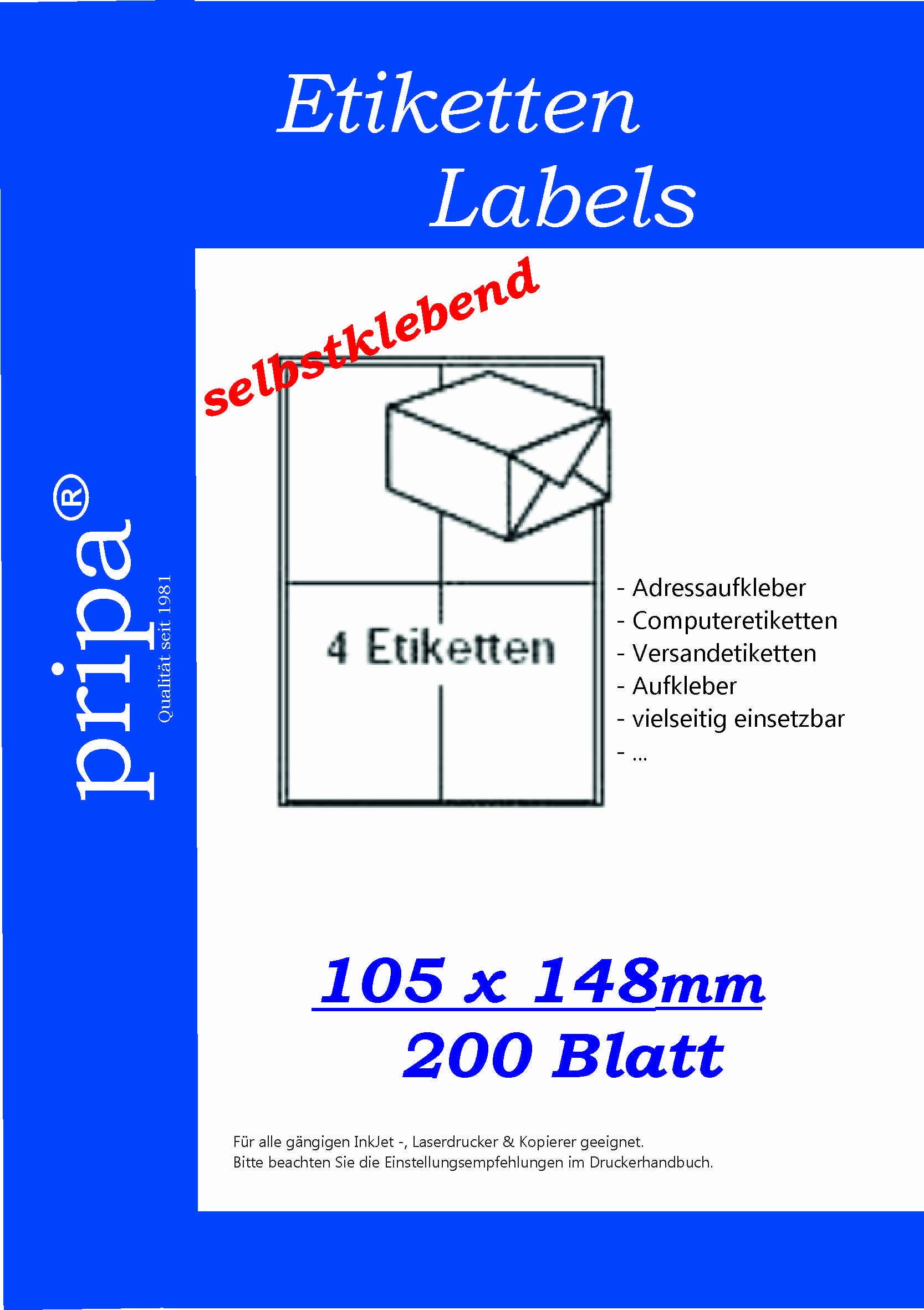 • Pripa Etiketten 105x74mm - 100 Bögen Selbstklebend Für Drucker & Kopierer
