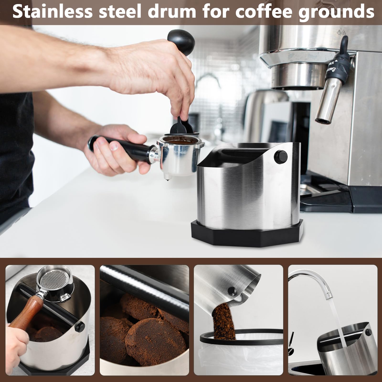 Perfekt für deine Espresso-Routine! Diese YYTECH Knock Box macht das Entsorgen von Kaffeesatz zum Kinderspiel. 🚀 Mit stolzen 1,8 Litern Fassungsvermögen passt da rein, was rein muss - ideal auch für kleine Cafés oder wenn mal Gäste kommen. Aus extra dickem 1,1mm Edelstahl gefertigt, hält sie ewig und sieht dabei noch mega stylisch aus. Der Clou: Die Klopfstange ist mit Silikon umwickelt - kein lautes Geklapper und dein Siebträger bleibt ohne Kratzer! Einfach abklopfen und der Satz löst sich sauber. Unten sorgt ein EVA-Kissen für rutschfesten Stand und dämpft den Sound. Die Stange lässt sich ganz easy demontieren - Reinigung ist damit ein Klacks. Ob für die Heimküche oder professionelle Nutzung - diese Box rockt deine Kaffee-Ecke! Maße: 14,8cm Breite, 13cm Höhe. Ein Must-have für jeden Barista! ☕