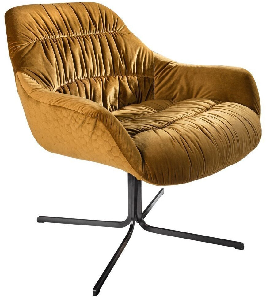 Material: 100% Polyester Samt • Gestell: Pulverbeschichtetes Metall • Maße: 76x80x83-90 cm • Sitzhöhe: 43-50 cm • Max. Belastung: 120 kg • Besonderheiten: 360° drehbar, höhenverstellbar • Farben: Senfgelb mit schwarzem Gestell
