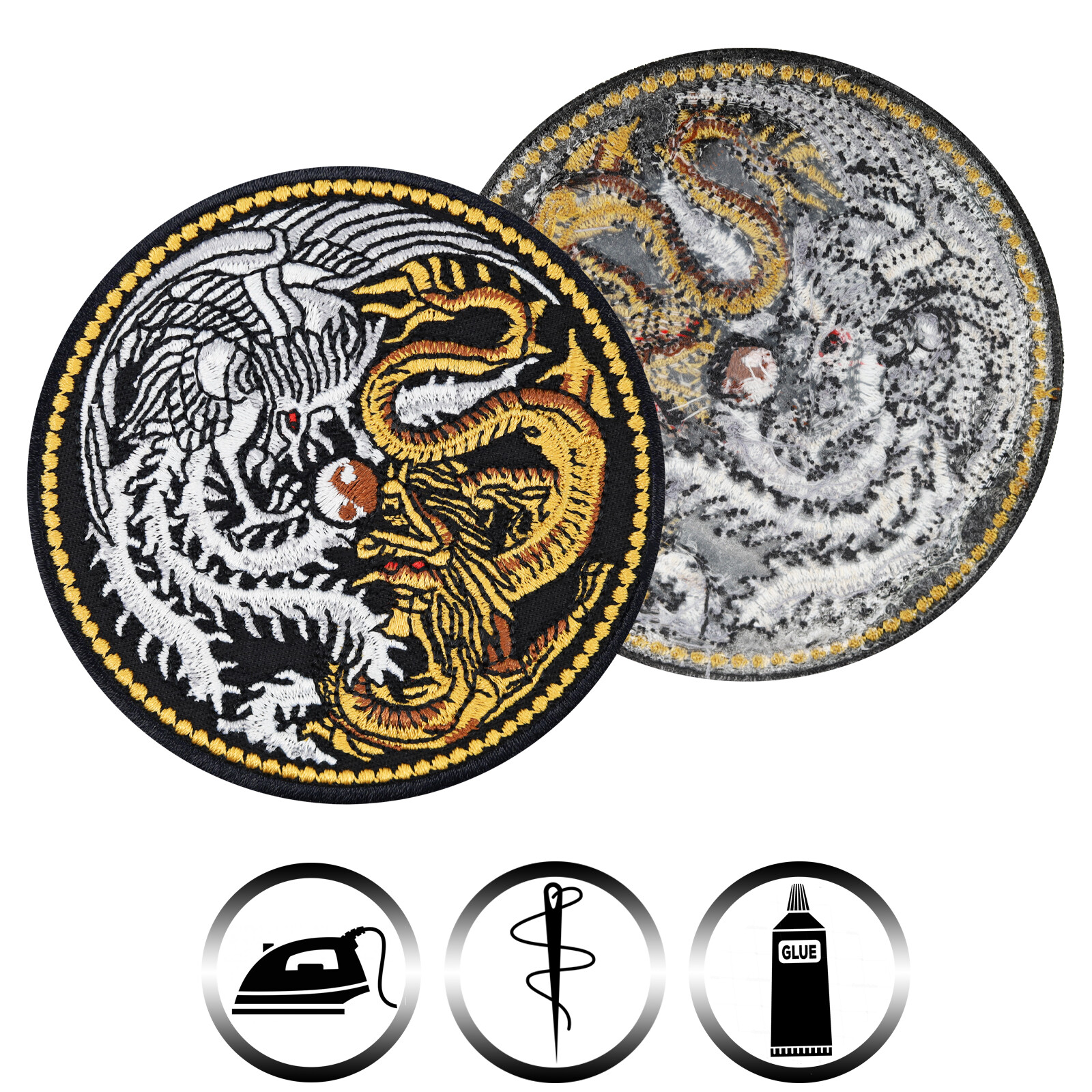 Coole Drachen-Aufnäher im Yin-Yang-Design - perfekt für alle Fantasy-Fans! Maße: 80x80mm, aus hochwertigem Polyester mit Viskose-Stickgarn. Kann aufgebügelt oder aufgenäht werden. Die Bügelbeschichtung hält super, ist aber trotzdem waschbar bis 60°C. Ideal für Jacken, Rucksäcke, Jeans - überall wo's was hermachen soll. Die Details sind gestickt, die Farben bleiben auch nach häufigem Waschen frisch. Ein echter Hingucker für individuelle Styles. Ob für Konzerte, Festivals oder einfach nur für den täglichen Look - mit diesem Patch bist du unverwechselbar!