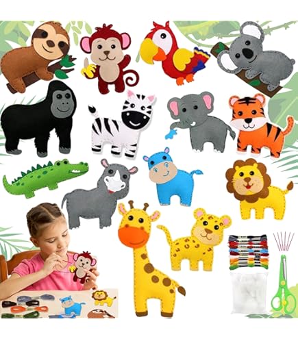 Kreativer Nähspaß für kleine Hände! Dieses komplette Filz-Nähset enthält alles, was Kinder ab 6 Jahren brauchen: 12 verschiedene Tier-Schnittmuster, buntes Stickgarn, kindersichere Plastiknadeln und weiche Baumwollfüllung.