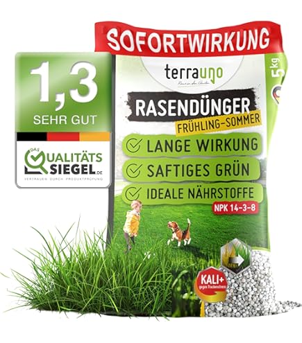 Mann, dein Rasen sieht nicht so gut aus? Mit diesem Pokon 3-in-1 Dünger wird darin ne saftig grüne Pracht! Der organische Mineraldünger macht drei Sachen auf einmal: düngen, kalken und das Gras stärken. Enthält essentielle Nährstoffe plus extra Magnesium und Eisen für diese schöne sattgrüne Farbe. Der hohe Kaliumgehalt macht deinen Rasen widerstandsfähiger gegen Moos und im Winter frostbeständiger. Und das pflanzenstärkende Mineral (Si) sorgt für aufrechter stehendes Gras, das sich besser mähen lässt. Die Dosierung ist einfach: März/April 1kg für 15qm, Mai/Juni 1kg für 15qm, September/Oktober 0,5kg für 15qm. Einfach mit nem Streuer gleichmäßig verteilen und bei Trockenheit wässern. Die Wirkung hält bis zu 3 Monate an! Achtung: Enthält Calciumoxid - also Handschuhe tragen und Hände danach waschen. Egal ob alter Rasen oder frisch verlegter Rollrasen - damit wird jeder Rasen zum Blickfang. Einfach ausstreuen, wässern und sich über den schönsten Rasen der Nachbarschaft freuen! Die 10kg Packung reicht für ca. 125qm - also mehr als genug für die meisten Gärten.