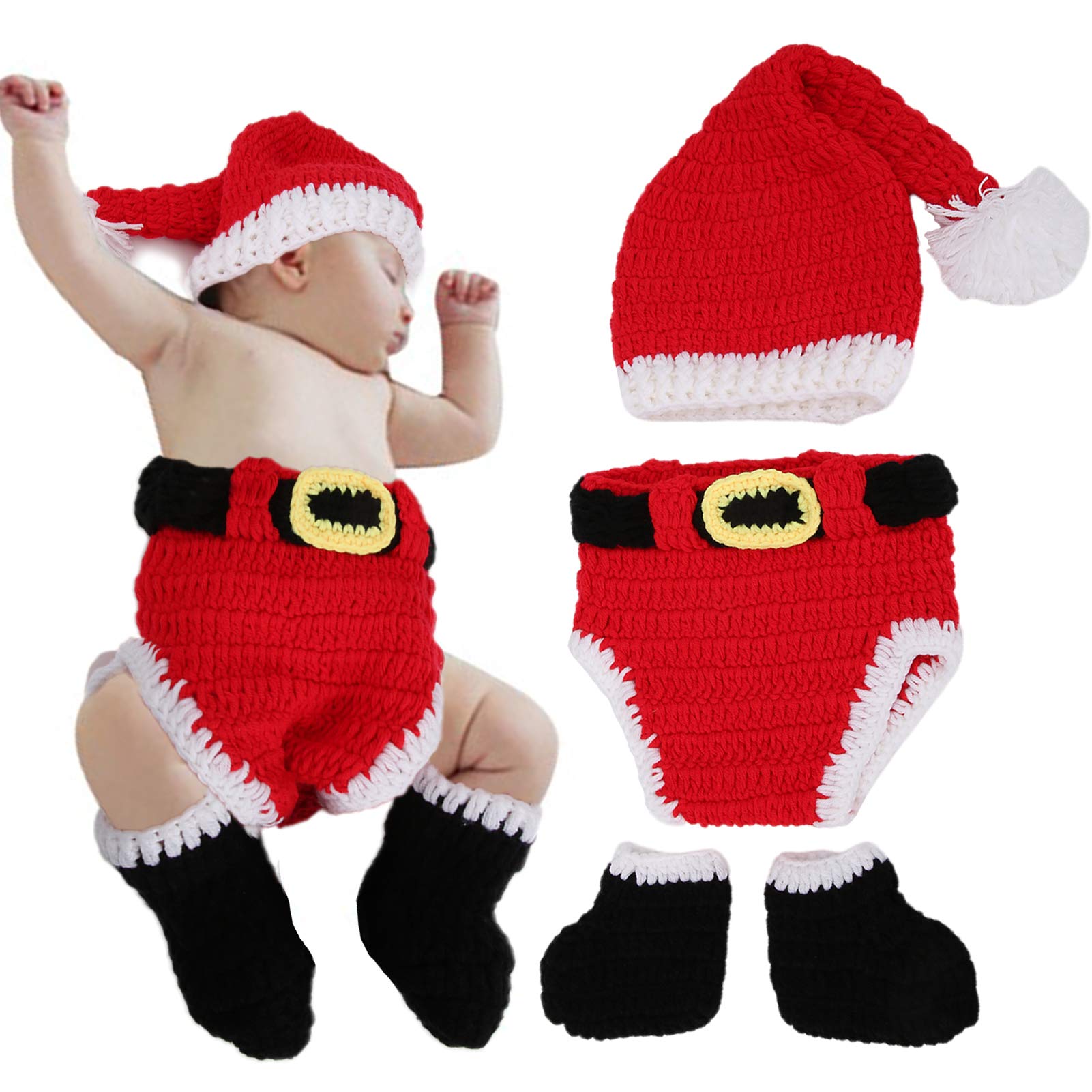 Oh wie süß! Dieses komplett handgehäkelte Weihnachts-Set verwandelt dein Baby in einen kleinen Weihnachtsmann. Enthalten sind: rote Mütze, Hose und ein Paar Stiefelchen - alles aus superweicher Baumwolle, die der zarten Babyhaut nicht schadet. Perfekt für Babys von 0-3 Monaten, ideal für Weihnachtsfotos, die erste Weihnachtsfeier oder als besonderes Geschenk. Die weiche, atmungsaktive Baumwolle sorgt für maximalen Komfort. Wichtig: Da alles handgehäkelt ist, kann die Größe minimal variieren. Vor dem ersten Tragen bitte von Hand waschen und lufttrocknen lassen. Macht unvergessliche Fotos und bringt alle zum Lächeln!