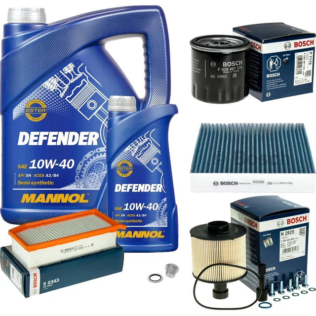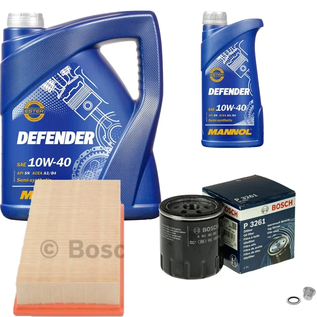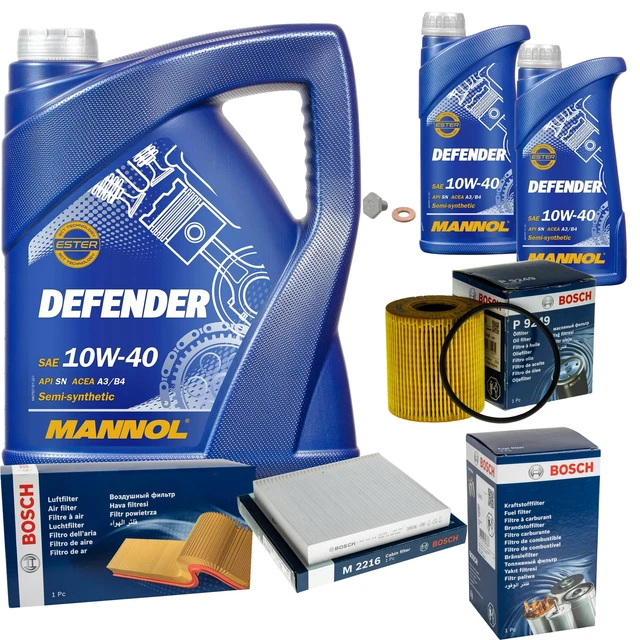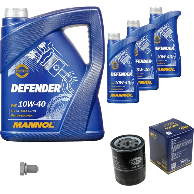Alles aus einer Hand für deinen nächsten Ölwechsel! Dieses Komplett-Set von MANNOL enthält alles, was du brauchst: 6 Liter Defender 10W-40 Motoröl (5L + 1L), einen Ölfilter, einen Luftfilter und einen Innenraumfilter. Das teilsynthetische Öl mit der einzigartigen StahlSynt Technologie reduziert den Verschleiß und schützt deinen Motor auch bei hohen Belastungen. Perfekt für Benzin- und Dieselmotoren mit und ohne Turbolader. Die beiliegenden SCT-Filter sorgen für optimale Leistung und saubere Luft im Motorraum. Das Öl ist ideal für neue und ältere Fahrzeuge mit hoher Laufleistung und kann die Ölwechselintervalle verlängern. Ein rundum sorgloses Paket für alle, die ihr Auto selbst warten wollen oder einfach die wichtigsten Ersatzteile auf Vorrat haben möchten. Qualität made in Germany, die überzeugt!
