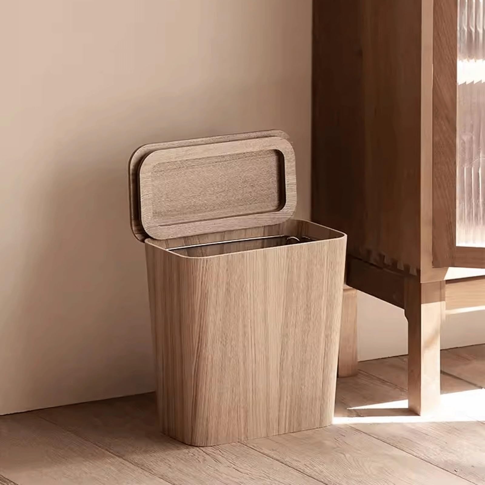 Dieser Retro-Mülleimer mit Holzmaserung sieht nicht nur gut aus, sondern ist auch super praktisch! Mit seinen Maßen von 22x22x26,8cm passt er perfekt unter Arbeitsplatten, in Badezimmer, Wohnheime oder Büros. Aus umweltfreundlichem PP-Material gefertigt, ist er kratzfest und langlebig. Der Schwenkdeckel macht die Bedienung super einfach - einfach mit der Hand aufklappen und den Müll entsorgen. Die Holzmaserung verleiht jedem Raum eine zeitlose Eleganz und passt sich harmonisch in asiatisch inspirierte und minimalistische Wohnkonzepte ein. Ob als Abfalleimer, Mülltonne oder Recyclingbehälter - dieser Mülleimer erledigt seinen Job diskret und zuverlässig. Die große Öffnung nimmt Standard-Müllbeutel problemlos auf und die stabile Form sorgt dafür, dass er nicht so leicht umkippt. Ein echter Hingucker, der dein Wohnambiente sofort aufwertet! Und keine Sorge wegen der Reinigung - das Material ist super leicht zu säubern. Einfach auswischen und schon sieht er wieder wie neu aus. Perfekt für alle, die nicht auf Stil verzichten wollen, auch bei praktischen Dingen wie Mülleimern!