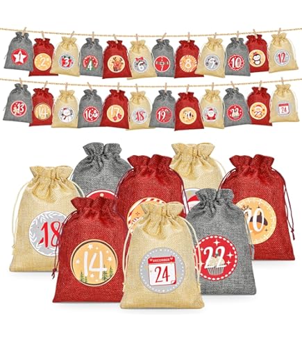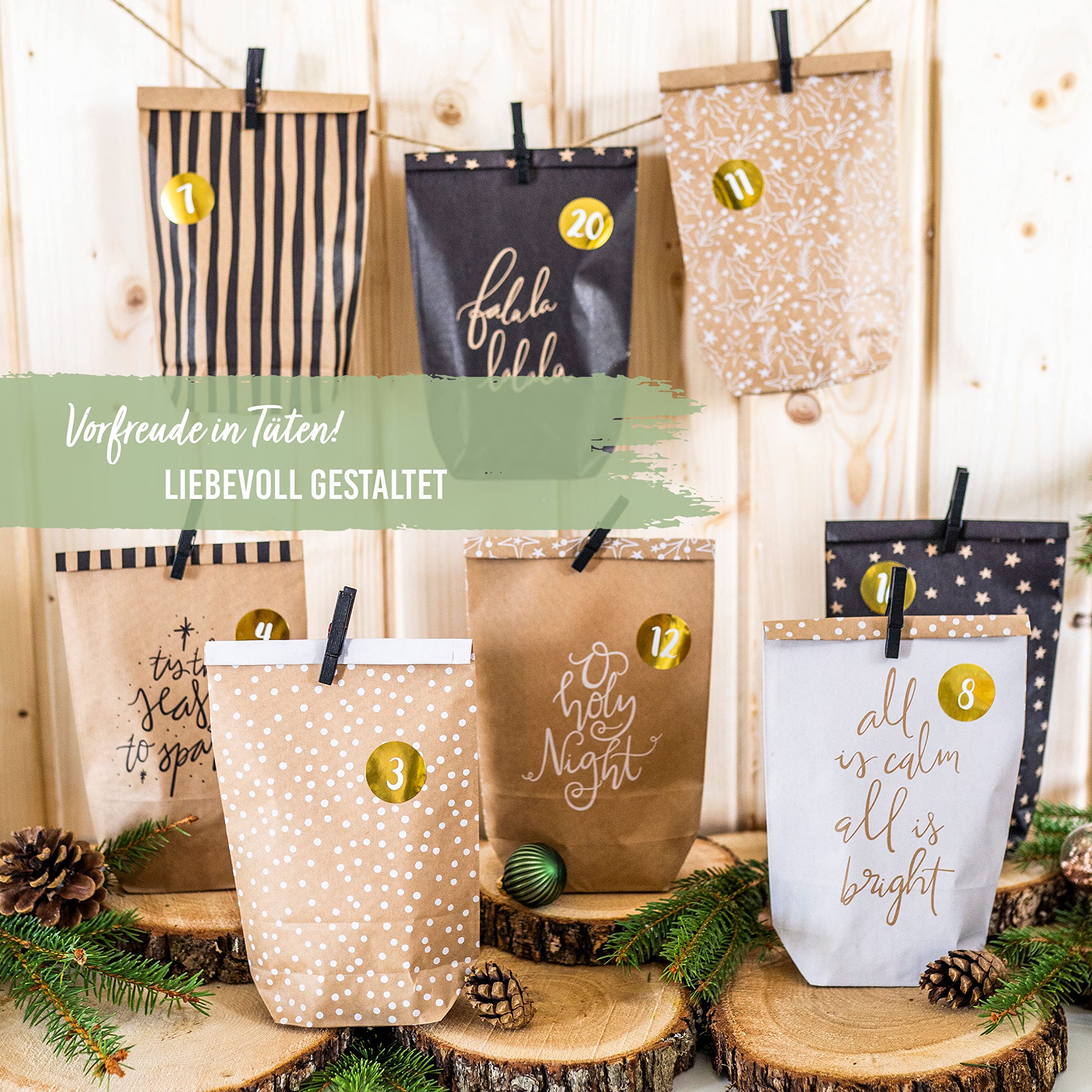Wow, mit diesem Adventskalender-Set kannst du deinen ganz persönlichen Kalender basteln! Enthalten sind 24 braune Kraftpapiertüten mit Boden - jede 22x14x5cm groß. Dazu 24 schwarz-weiße Zahlenaufkleber im Tafelmotiv (4cm Durchmesser) und 24 doppelseitige Klebepunkte zum Verschließen. Du musst nur noch die Tüten mit Süßigkeiten, kleinen Geschenken oder Gutscheinen befüllen, die Aufkleber aufkleben und mit den Klebepunkten verschließen. Dann kannst du sie auf einer Schnur aufhängen oder im Regal aufstellen. Sieht total schön aus und macht viel mehr her als ein gekaufter Kalender! Hergestellt in Deutschland in einer Werkstatt für Menschen mit Behinderung - also unterstützt du damit auch noch einen guten Zweck. Die Qualität ist top - die Tüten sind stabil und die Aufkleber kleben super. Einfach eine schöne Tradition für die Vorweihnachtszeit die die Vorfreude auf Weihnachten noch größer macht!