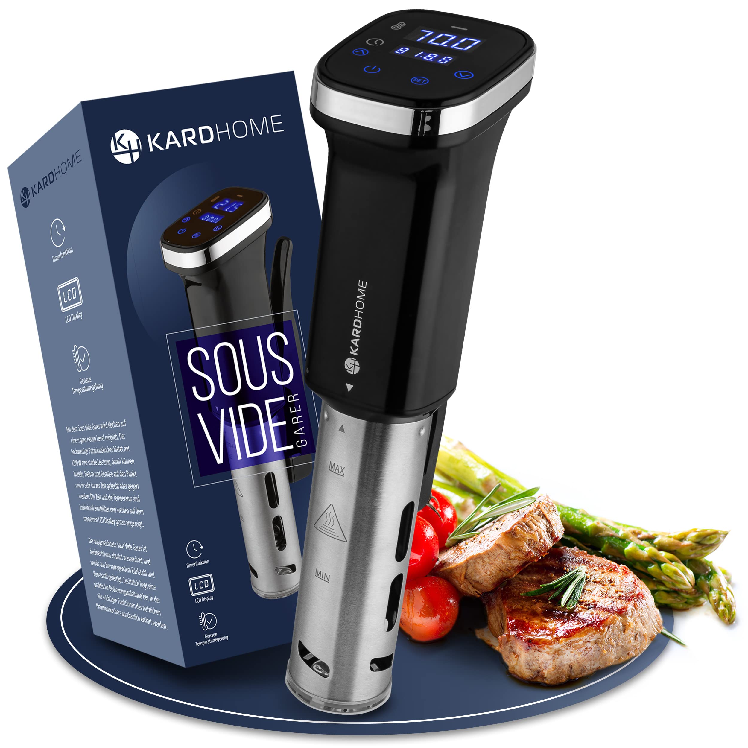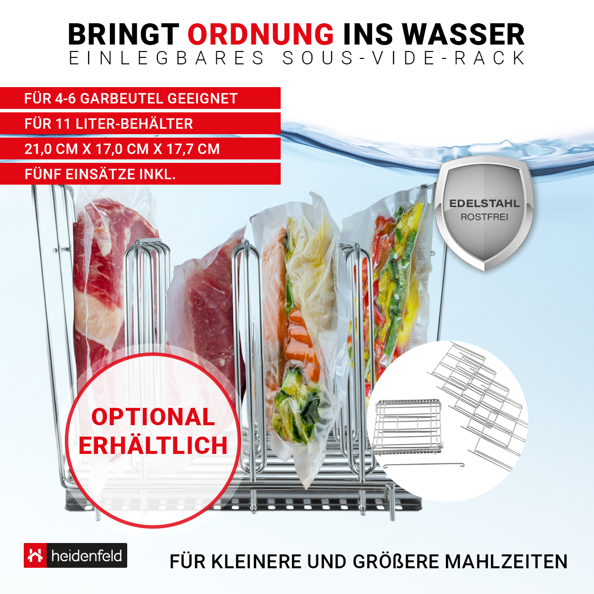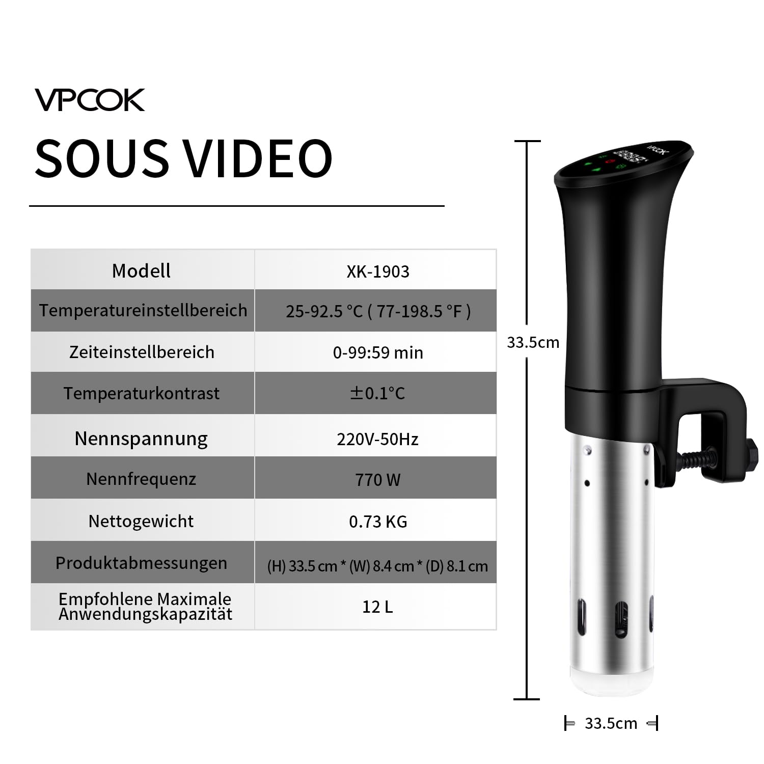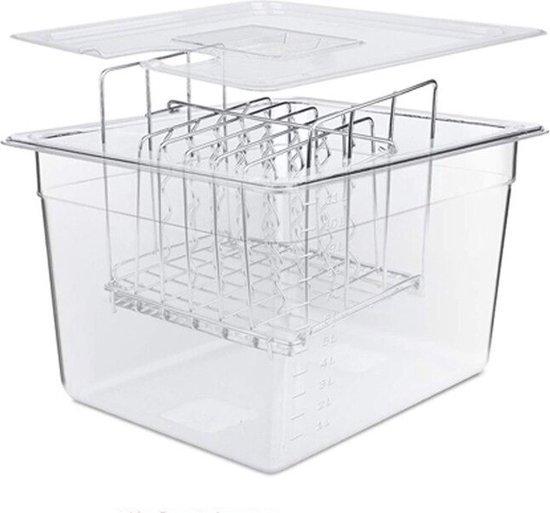 Perfektes Sous-Vide-Garen leicht gemacht! Dieser 11-Liter-Behälter ist der ideale Partner für deinen Sous-Vide-Zirkulator. Mit den praktischen Liter- und Quart-Markierungen auf der Seite misst du immer die perfekte Wassermenge ab - so gelingen deine Gerichte garantiert.\\n\\nDas geniale faltbare Scharniermachung: Wenn du ihn nicht brauchst, klappst du ihn einfach zusammen und verstaut ihn platzsparend in der Küche. Kein lästiges Rumstehen mehr von klobigen Küchenutensilien!\\n\\nDer mitgelieferte Deckel verhindert das Verdunsten von Wasser - das spart Energie und dein Zirkulator arbeitet effizienter. Aus hochwertigem Polycarbonat in Lebensmittelqualität gefertigt, ist der Behälter bis 100°C hitzebeständig, verschleißfest und langlebig.\\n\\nKompatibel mit den meisten Sous-Vide-Geräten auf dem Markt. Einfach aufstellen, Wasser einfüllen, Zirkulator anbringen und los geht's mit dem professionellen Garen. Ob Fleisch, Fisch, Gemüse oder Desserts - mit diesem Behälter wird Sous-Vide-Kochen zum Kinderspiel. All-in-One-Lösung für perfekte Ergebnisse!
