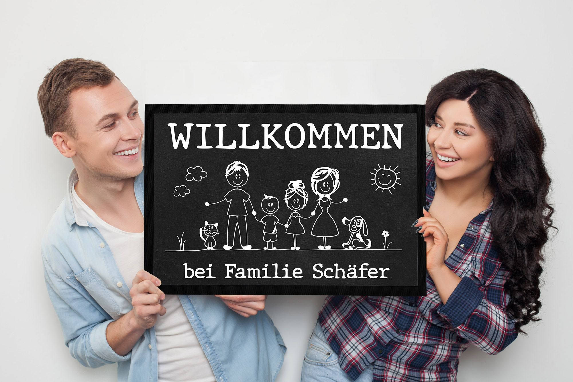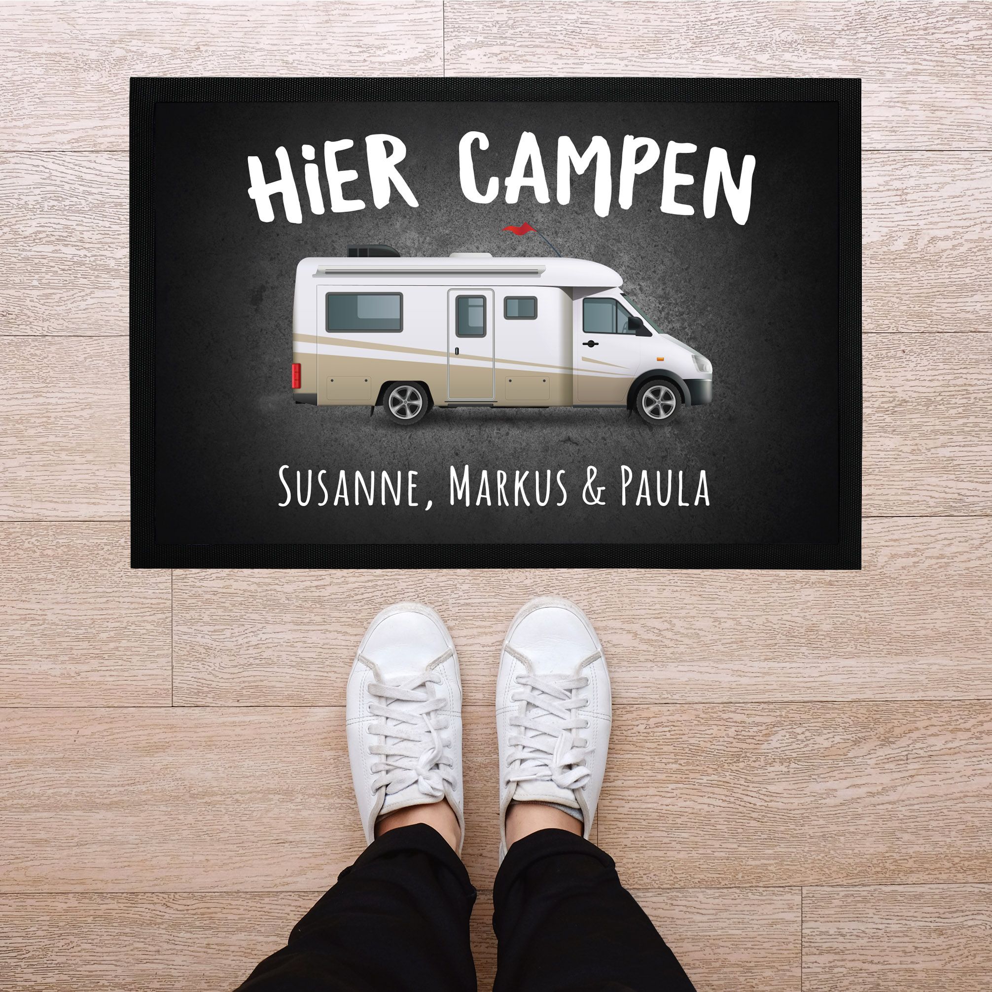Oh wie süß! Diese personalisierte Fußmatte macht jedes Kinderzimmer sofort gemütlicher. Der schlafende Teddy auf der Mondsichel ist einfach niedlich und der Spruch \\\Hier spielt, lacht und träumt...\\\ mit dem Namen deines Kindes drauf - das ist doch mal was Besonderes!\\n\\nNicht nur hübsch anzusehen, sondern auch super praktisch: Die Matte ist rutschfest dank der Gummirückseite und hat einen flachen Rand, sodass niemand drüber stolpert. Perfekt also für kleine und große Füße!\\n\\nDas Material ist robust und abwaschbar - wenn mal was daneben geht, einfach mit milder Seife abwischen und an der Luft trocknen lassen. Die Farben bleiben dabei schön kräftig, weil die Matte in Deutschland mit modernen Druckverfahren hergestellt wird.\\n\\nOb als Türschild-Alternative, als kleiner Teppich vorm Bett oder einfach als Deko-Highlight - diese Matte ist ein echter Hingucker. Und als Geschenk zur Geburt, Taufe oder zum Geburtstag kommt sie immer gut an!\\n\\nDu kannst sie online ganz easy selbst gestalten: Einfach Design aussuchen, Namen eingeben und schon wird deine individuelle Matte produziert. So hat jedes Kind sein ganz persönliches Stück im Zimmer!\\n\\nEinfach zauberhaft - und praktisch obendrein!