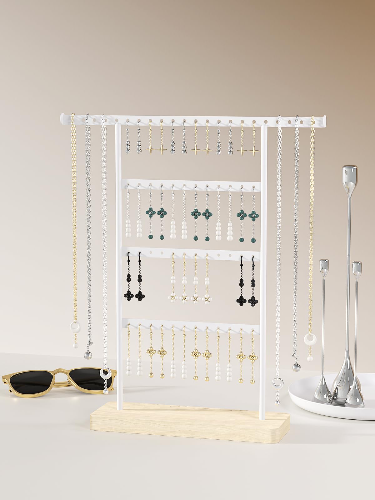 Endlich Ordnung im Schmuckkästchen! Dieser Ohrring-Ständer aus Metall mit Holzsockel ist perfekt, um all deine Ohrringe, Ketten und Armbänder übersichtlich zu präsentieren. Mit 4 Etagen und insgesamt 58 Aufhängeplätzen - da findet alles Platz! Die Gesamthöhe beträgt 31,8 cm, passt also super auf Kommode, Schreibtisch oder ins Regal. Besonders praktisch: Er kommt in zwei Teilen und ist blitzschnell zusammengesteckt - kein Werkzeug nötig! Sieht nicht nur schick aus, sondern macht auch jeden Ohrring sofort griffbereit. Perfekt für zu Hause, aber auch für Geschäfte, die Schmuck verkaufen. Das schlichte Design passt zu jedem Einrichtungsstil. Ein super Geschenk für die beste Freundin, Schwester oder einfach für dich selbst! Nie wieder suchen - alle Lieblingsteile sind immer perfekt sichtbar. Aus robustem Material, das lange hält. Ein echter Organization-Helfer für alle Schmuck-Liebhaberinnen!