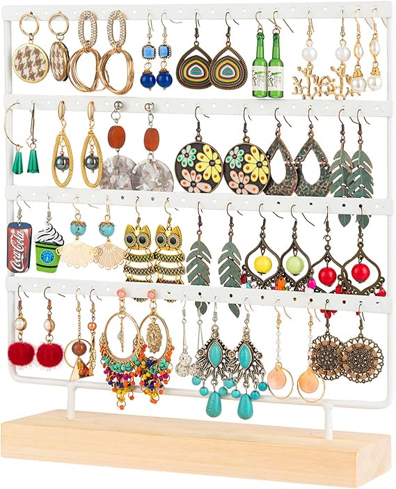 Endlich Ordnung im Schmuckkästchen! Dieser hübsche Ohrringständer aus Holz in reinem Weiß bietet Platz für ganze 72 Ohrringe - ob Stecker, Hänger oder Clips. Mit nur 35x5x40 cm passt er perfekt auf deine Kommode oder den Nachttisch. Der Aufbau ist kinderleicht: Einfach die Teile zusammenstecken und Schrauben anziehen - fertig! Die 8 extra Holzschrauben sind praktisch für Armbänder oder andere Kleinigkeiten. Sieht nicht nur ordentlich aus, sondern ist auch eine echte Deko fürs Schlafzimmer oder Ankleidezimmer. Super Geschenkidee für Mama, Freundin oder Tochter zu Weihnachten, Geburtstag oder Valentinstag! Mach deine Ohrring-Sammlung zum Hingucker!
