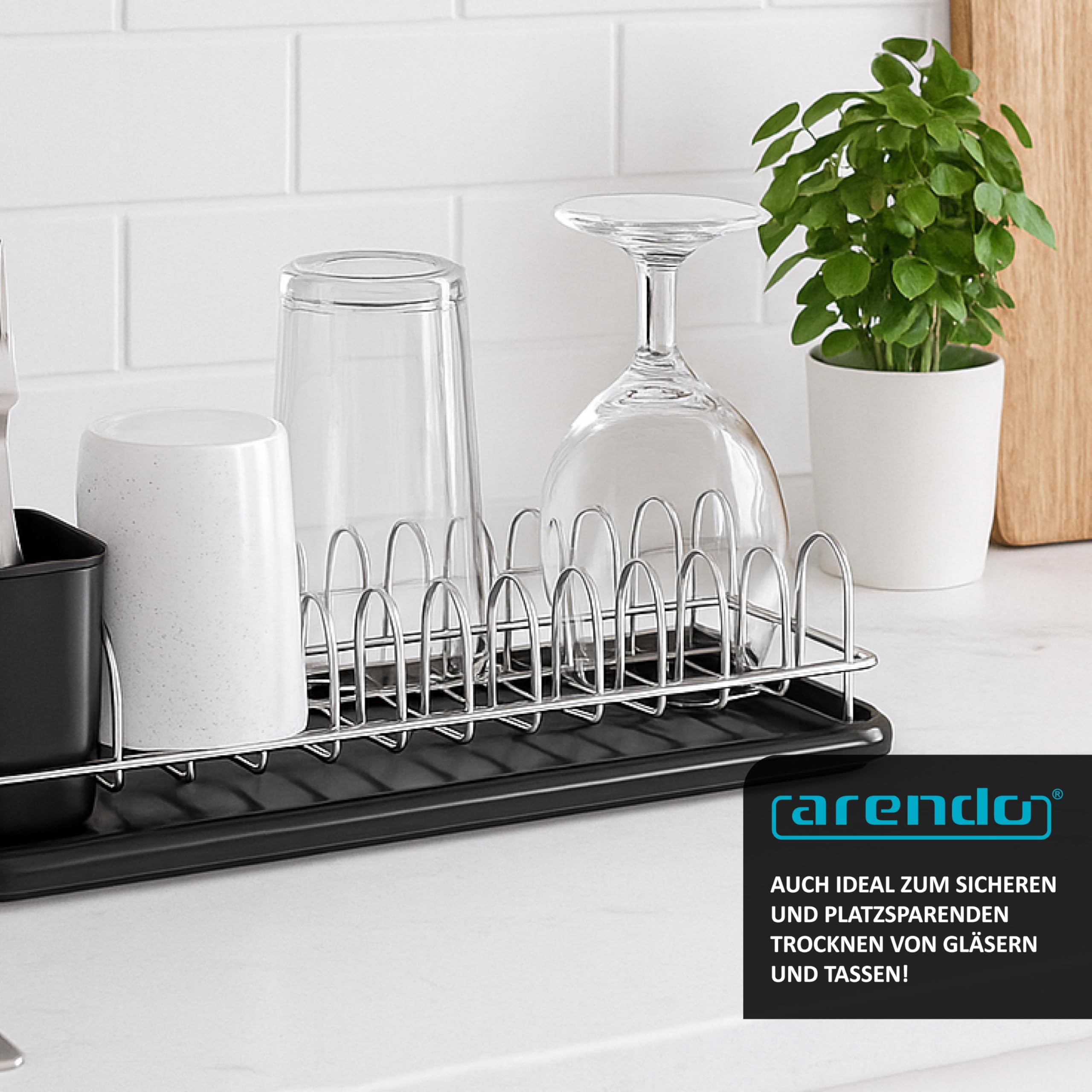 Perfekt für kleine Küchen! Dieser kompakte Arendo Geschirrständer bietet Platz für 12 Teller, Deckel oder Schüsseln. Mit zwei praktischen Besteckhaltern und separater Abtropfschale.