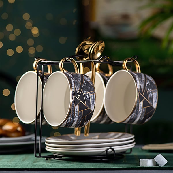 Endlich Ordnung in deinem Küchenregal! Dieser elegante Tassenständer von Fosinz in Gold bietet Platz für 6 Tassen mit ihren Untertassen. Aus robustem Edelstahl gefertigt, wackelt er nicht und steht sicher auf jeder Oberfläche. Die rutschfeste Unterseite schützt deine Möbel vor Kratzern, und die stabilen Haken halten auch dickere Tassen sicher fest. Mit den Maßen 6,7 x 8,5 Zoll (etwa 17 x 21,5 cm) ist er kompakt aber dennoch geräumig. Perfekt für die Küche, das Büro oder auch für Cafés - so hast du deine Lieblingstassen immer griffbereit und ordentlich präsentiert. Ein super Geschenk für Kaffee- und Teeliebhaber! Einfach aufstellen, Tassen aufhängen und sich über mehr Ordnung freuen. So praktisch und dabei noch stylisch!