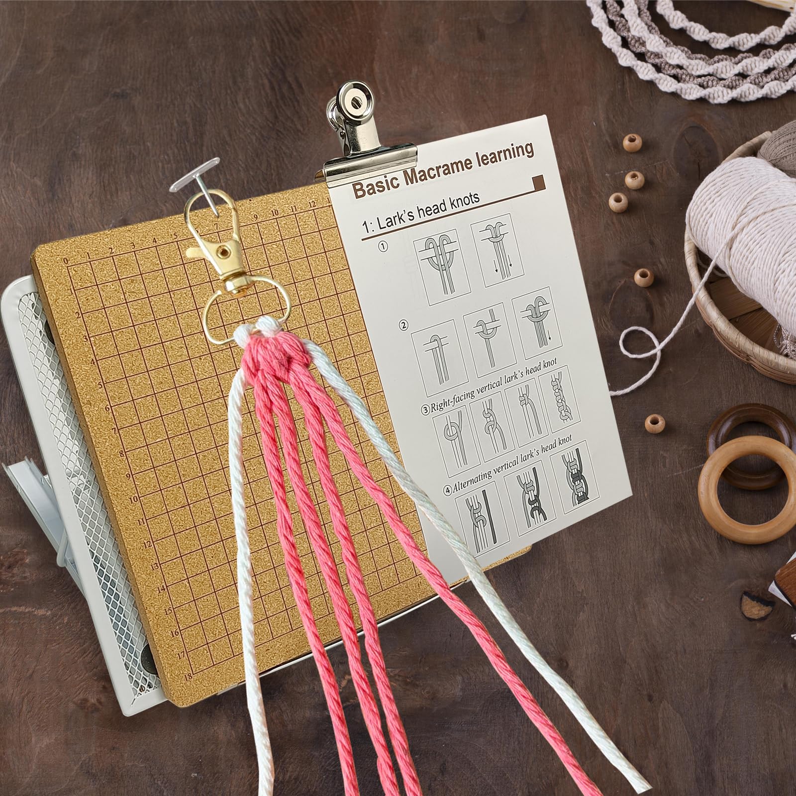 Warum ist das so praktisch? Der Ständer hilft dir die richtige Höhe einzustellen - kein Rückenschmerz mehr beim Flechten! Und das Brett mit den Clips hält alles sicher fest. So machst du keine Fehler und deine Knoten werden perfekt.