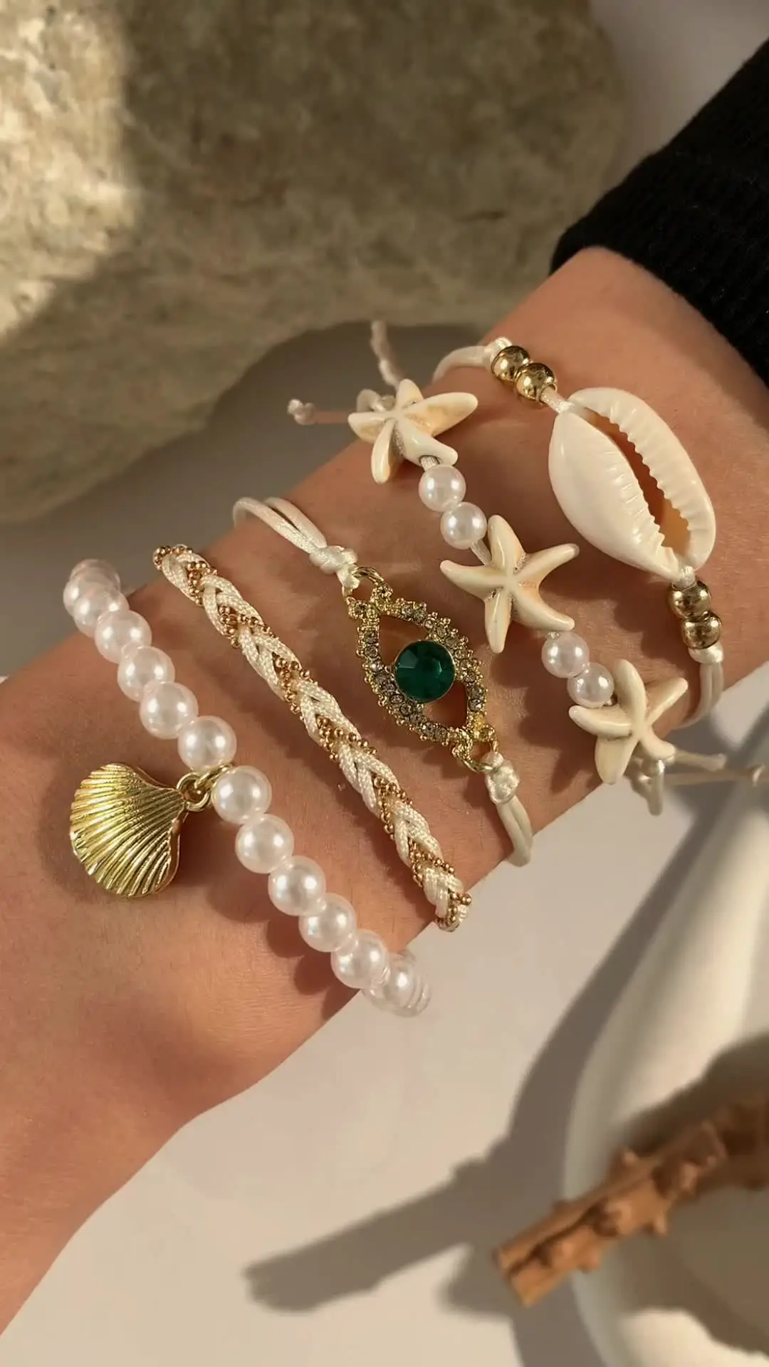 Dieses süße 7-teilige Armband-Set im Boho-Stil bringt Strand-Feeling an dein Handgelenk! Die Armbänder kombinieren echte Muscheln, Perlen und vergoldete Akzente zu einem traumhaften Meerjungfrau-Look. Dank des elastischen Materials passen sie sich jeder Handgelenkgröße an (5,3-8,5 cm) und du kannst sie super einfach alleine oder gestapelt tragen. Perfekt für den Sommerurlaub, Festivals oder einfach um deinem Alltags-Outfit einen Hauch von Meer zu verleihen. Die natürlichen Muscheln sind alle einzigartig - jedes Armband ein Unikat! Super leicht und wasserfest, also auch ideal für Strandtage oder Schwimmbad. Ob mit weißem Kleid, Jeans oder Badeanzug - diese Armbänder passen immer und machen sofort gute Laune. Ein wunderschönes Geschenk mit der Bedeutung 'Segen des Meeres' für deine beste Freundin oder einfach für dich selbst!