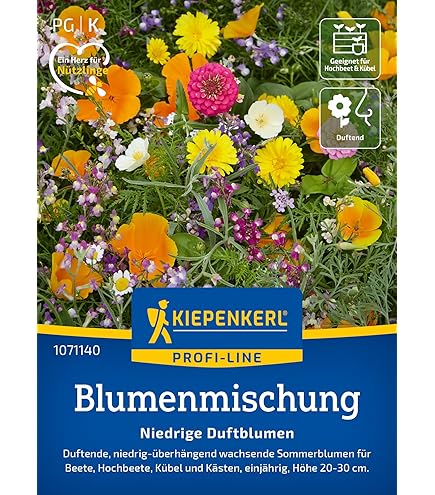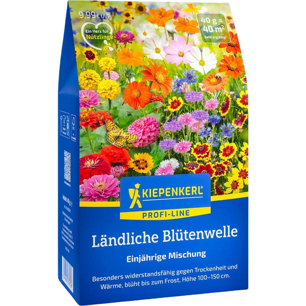 Garten-Freunde, macht euren Garten zur blühenden Oase für Bienen & Schmetterlinge! Diese Kiepenkerl Profi-Line Blumenmischung 'Ländliche Blütenwelle' ist einfach der Hammer! Super widerstandsfähig gegen Trockenheit und Hitze - blüht von Juli bis zum ersten Frost durch! Die Mischung ist total artenreich und lockt Nützlinge wie verrückt an. Mit der praktischen Streuhilfe aus Holzfaser geht die Aussaat super einfach und gleichmäßig. Made in Germany - Kiepenkerl Qualität seit 1925! Jede Charge wird streng geprüft - für beste Keimfähigkeit. Perfect für größere Flächen, macht aus langweiligen Ecken bunte Blütenmeere! Schon nach etwa 40 Tagen siehst du die ersten Blüten - das motiviert! Ob im Beet oder sogar im Balkonkübel - diese Mischung rockt! Für mehr Biodiversität im eigenen Garten - und sie sieht einfach umwerfend aus! Einfach aussäen, angießen und dich über Monate an der Farbenpracht erfreuen!