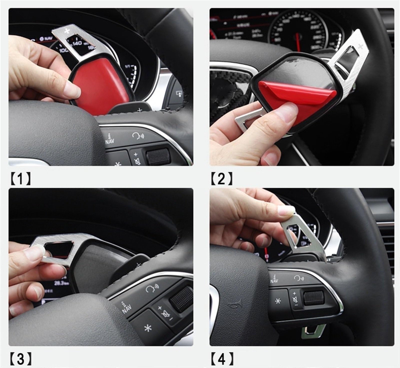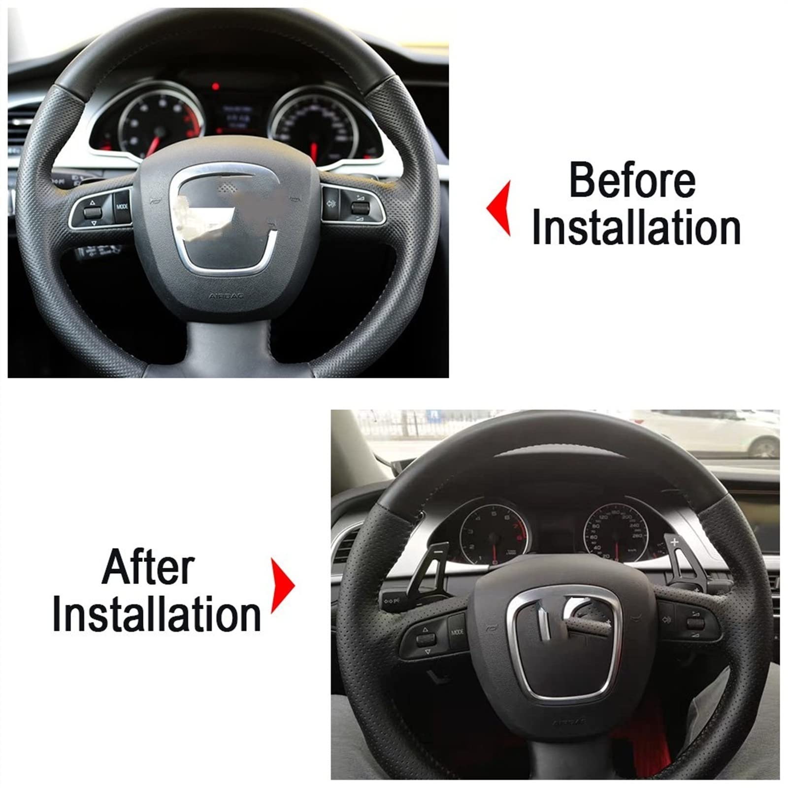 Du fährst Audi und willst mehr Sportlichkeit? Diese Schaltwippen-Verlängerungen machen dein Lenkrad direkt um einiges aggressiver! Die Teile sind aus robustem ABS-Material und passen perfekt auf deine vorhandenen Schaltwippen. Ob A3, A4, A5, A6, A7, A8, Q3, Q5, Q7, TT, S3, R8 oder S5 - da ist für fast jedes Audi-Modell was dabei. Die Installation ist mega einfach: Alte Wippen ab, neue drauf, Schrauben festziehen - fertig! Kein Werkzeug nötig, das schaffst du in 5 Minuten. Durch die Verlängerung erreichst du die Schaltwippen viel bequemer, ohne die Hände vom Lenkrad zu nehmen. Und das Fiber Black Design sieht einfach hammer aus - wie aus dem Tuning-Katalog! Dein Innenraum wirkt sofort sportlicher und hochwertiger. Fühlt sich an wie 'n RS-Modell, ohne dass du 'n Vermögen ausgeben musst. Einfach einsteigen, schalten und grinsen!