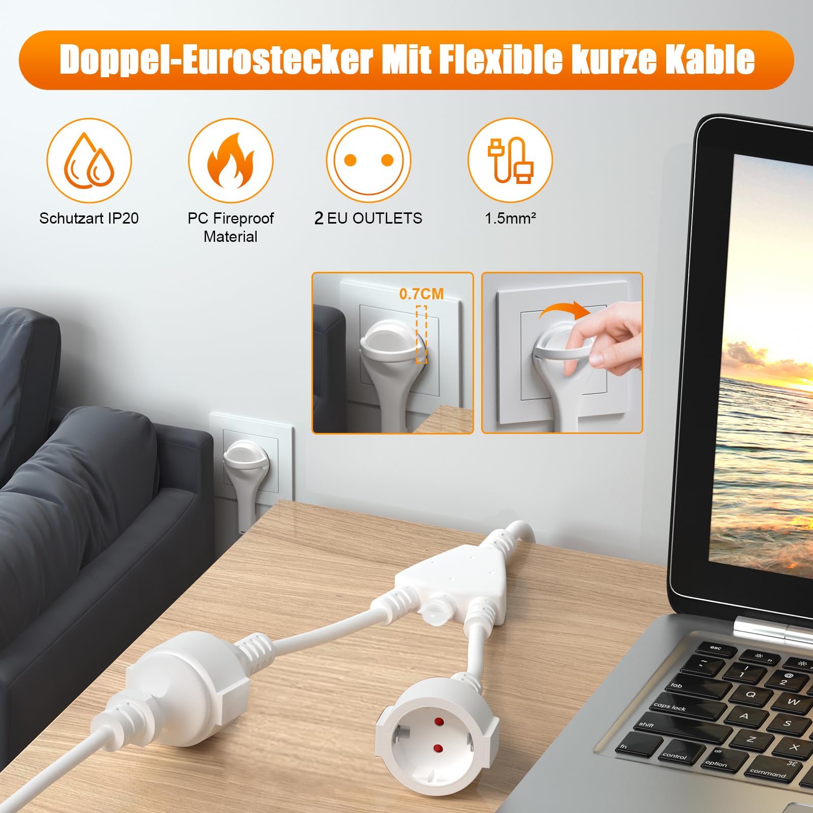 Doppelte Steckplätze - halber Stress! Dieser praktische Doppelstecker verwandelt eine Steckdose in zwei - perfekt für Orte, wo Steckdosen Mangelware sind. \\n\\n• 2 Schuko-Steckdosen • 16A/250V, 4000W max. • IP20 Schutzklasse • 1.5mm² Kabelquerschnitt • Aus hochwertigem PP-Material \\n\\nEinfach in die Wandsteckdose stecken und schon hast du zwei Steckplätze für Handy, Laptop, Lampe oder was auch immer du anschließen willst. Mit Überspannungs-, Überstrom- und Kurzschlussschutz für maximale Sicherheit. Perfekt fürs Homeoffice, die Küche, Werkstatt oder überall dort, wo du mehr Steckplätze brauchst. Seit ich den habe, muss ich nicht mehr ständig Geräte aus- und einstecken - endlich Platz für alles! Einfach einstecken und doppelt so viele Geräte anschließen.
