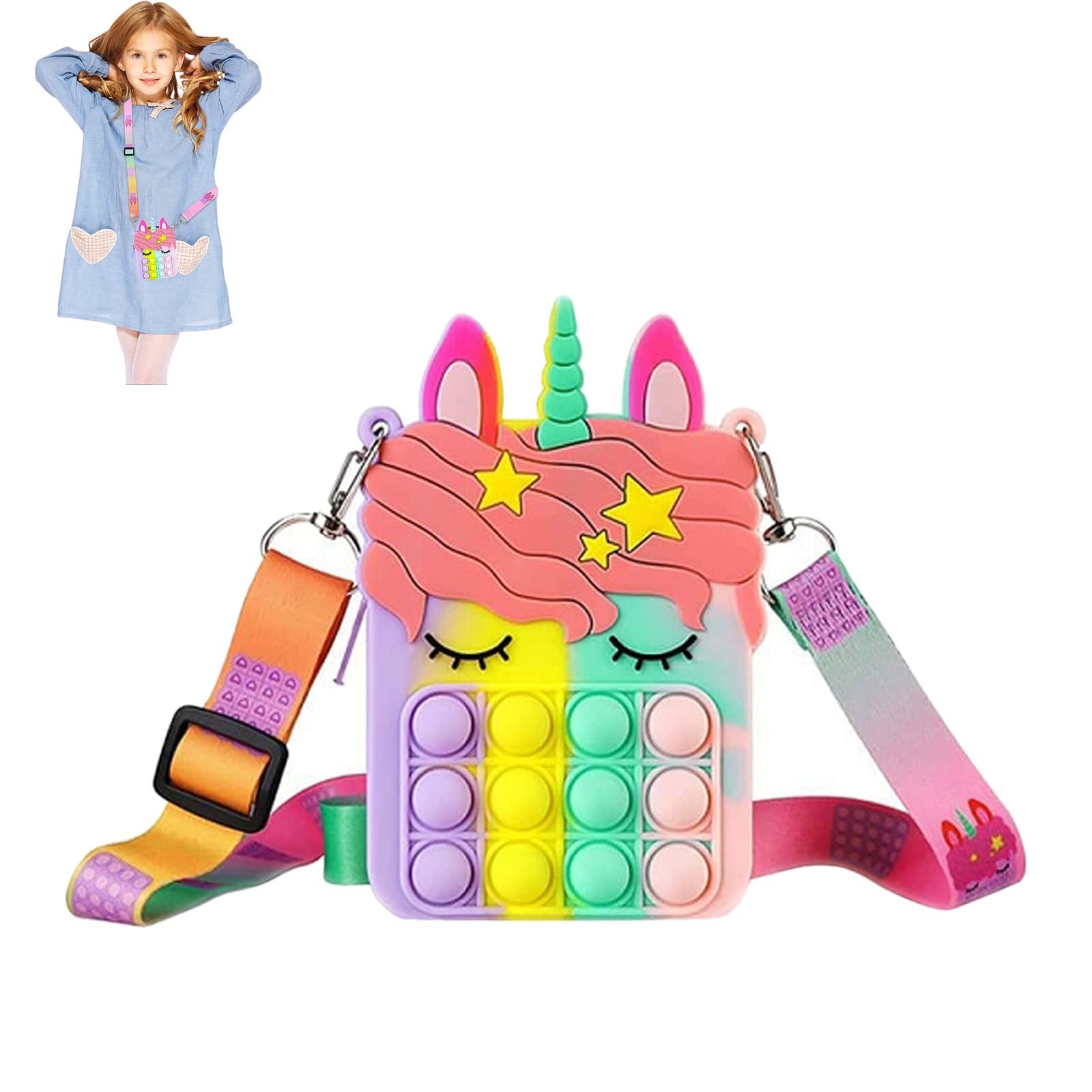 Total niedlich! Diese Einhorn Umhängetasche wird jedes Mädchenherz höher schlagen lassen. Aber sie ist nicht nur hübsch - sie hat auch eine geniale Anti-Stress-Funktion! Aus weichem, wasserdichtem Silikon gefertigt, das sich super anfühlt und leicht zu reinigen ist. Mit verstellbarem Schultergurt, der sich jeder Größe anpasst. Der Reißverschluss lässt sich leicht öffnen und schließen, perfekt für kleine Hände. Das Besondere: Die Tasche dient auch als Blubberfolie-Spielzeug - einfach die Blasen drücken und Stress abbauen! Perfekt für unterwegs, um Kleingeld, Schlüssel oder kleine Schätze aufzubewahren. Ein ideales Geschenk für Geburtstage, Feiertage oder einfach so. Bringt nicht nur Ordnung in die Kindersachen, sondern auch jede Menge Spaß!