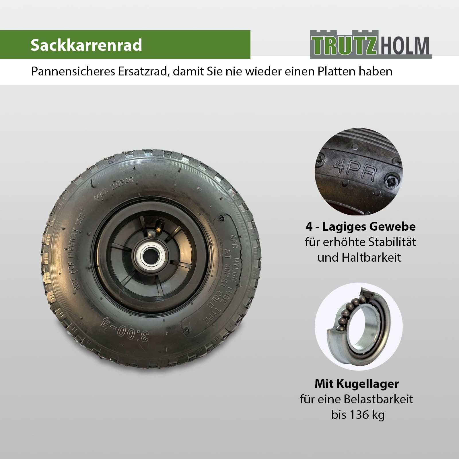 Boah, diese Sackkarrenräder von TRUTZHOLM sind echt ein Game-Changer für jeden, der regelmäßig was transportieren muss! Das 2er-Set kommt mit nem ordentlichen 3.00-4 Luftreifen, der mit seinem 4-lagigen Gewebe (4PR) richtig was aushält. Jedes Rad trägt bis zu 120kg - damit kannst du auch schwere Sachen easy bewegen.\\n\\nDie Maße passen perfekt: Ø26cm Durchmesser und 8,5cm Breite. Die rote Kunststofffelge ist komplett rostfrei und hält auch bei Regen und Schnee stand. Das coole abgewinkelte Autoventil aus Metall macht das Aufpumpen mega einfach - selbst wenn das Rad schon eingebaut ist.\\n\\nDie Nabe hat 20mm Durchmesser und 75mm Länge, passt also auf die meisten handelsüblichen Achsen von Sackkarren, Bollerwagen oder Gartenwagen. Mit nur etwa 1kg Gewicht pro Rad bleibt dein Gefährt super beweglich.\\n\\nOb im Lager, aufm Bau, im Garten oder beim Umzug - die Dinger rollen sich richtig gut und federn Unebenheiten super ab. Die Kugellager sorgen für nen lässigen Lauf. Wenn mal ein Rad kaputt geht oder du ein Ersatzrad brauchst, bist du mit diesem Set bestens ausgestattet!