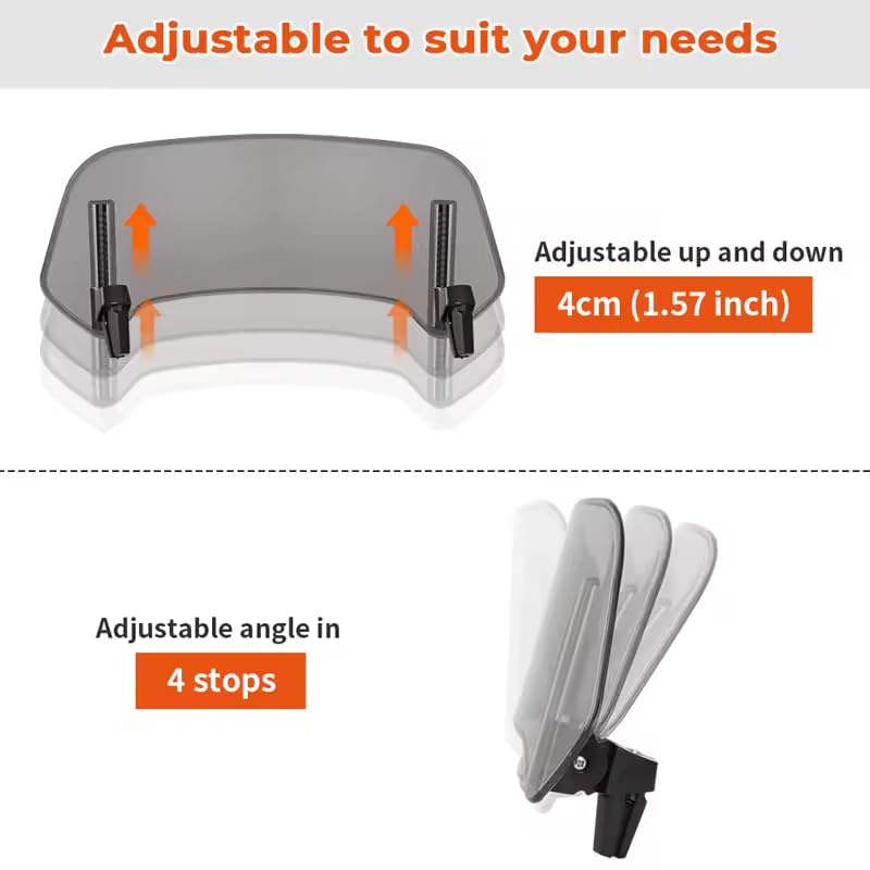 Mehr Komfort auf deiner BMW F800GS! Dieser verstellbare Windschild-Aufsatz reduziert spürbar den Winddruck auf Brust, Nacken und Schultern. Aus kratzfestem Acryl gefertigt, bietet er klare Sicht bei jedem Wetter. Die flexible Clip-On-Montage ermöglicht individuelle Anpassung von Höhe und Neigung - perfekt abgestimmt auf deine Fahrweise. Ohne Bohren montiert, einfach auf das vorhandene Windschild aufgesteckt. Ob auf langen Touren oder im Alltag - weniger Turbulenzen und Windgeräusche sorgen für entspanntes Fahren. UV-beständig und extrem robust, hält auch bei schnellen Fahrten problemlos stand. In transparent erhältlich, misst 360x140mm. Einfach in wenigen Minuten installiert - schon bist du bereit für dein nächstes Abenteuer! Für mehr Stabilität und Komfort auf jeder Strecke.