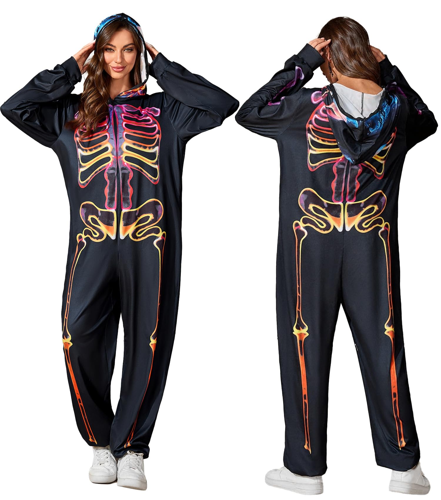Gruseleffekt garantiert! Dieses Skelett-Kostüm leuchtet richtig cool im Dunkeln und macht dich zur Attraktion auf jeder Halloween-Party. Der schwarze Jumpsuit aus weichem Polyester sitzt bequem und hält dich warm. Mit praktischem Reißverschluss vorne - schnell an- und ausgezogen. Die Kapuze mit Skelett-Aufdruck und die eingebauten Taschen für Handy und Geld sind super praktisch. In verschiedenen Größen von S bis XXL erhältlich. Einfach zu pflegen - per Hand oder in der Maschine waschen. Perfekt für Kostümpartys, Cosplay-Events oder wenn du einfach mal jemand anderes sein willst. Mach die Nacht zum gruseligen Erlebnis!