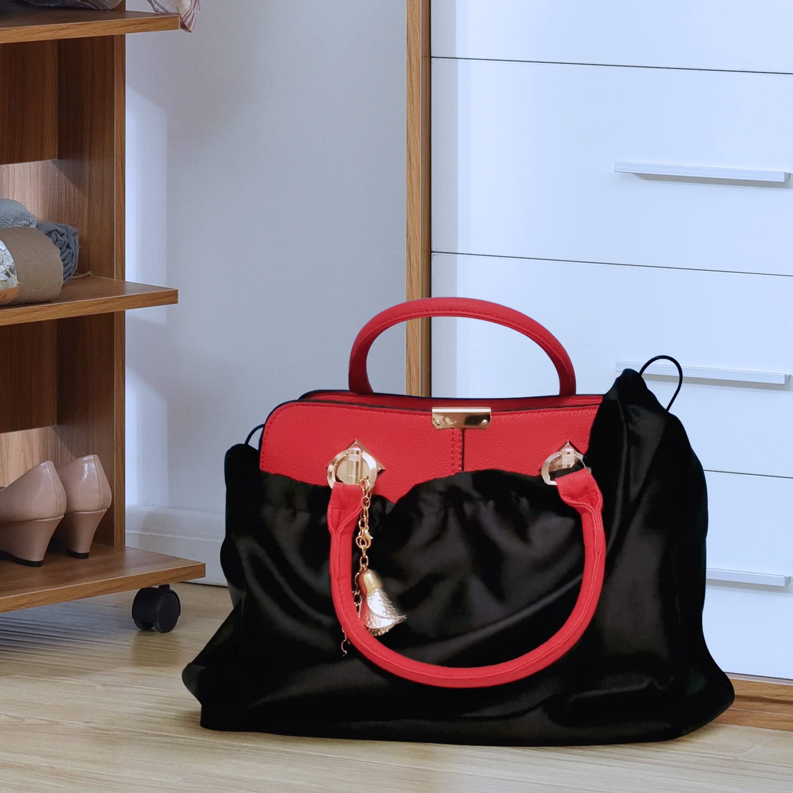 Hey, deine teuren Handtaschen verdienen den besten Schutz! Diese Staubbeutel aus Seidenstoff bewahren sie vor Staub, Kratzern und Licht.\n\n5 Stück im Set - alle in schwarz. Aus weichem Hautsamt-Material das glatt und schonend ist. Maße: 40x50cm - passen für die meisten Handtaschen-Größen.\n\nDer Kordelzug-Verschluss ist super praktisch:\n- Einfach zu öffnen und schließen\n- Sicherer Verschluss\n- Schneller Zugriff\n\nNicht nur für Handtaschen gut:\n- Geldbörsen und Accessoires\n- Reise-Organizer\n- Aufbewahrung von Kleidung\n- Ordnung im Schrank\n\nDie Beutel sind vielseitig einsetzbar und helfen dir, Ordnung zu halten. Deine Lieblingsteile bleiben geschützt und sehen länger neu aus.\n\nWenn du Wert auf deine Taschen legst und sie lange schön halten willst, sind diese Beutel ein Muss. Einfach bestellen und deine Schätze schützen!\n\nWeißt du was? So eine praktische Aufbewahrungslösung sollte jeder haben. Macht das Leben ordentlicher und schont deine Lieblingsstücke!