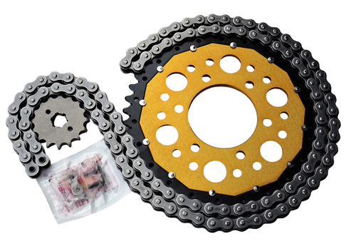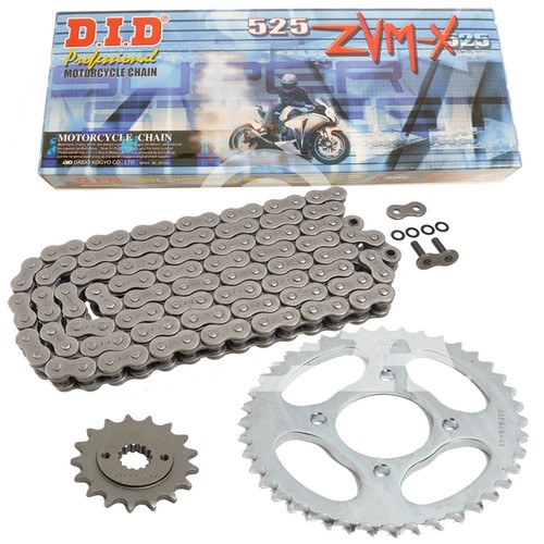 Die japanische DID-Kette ist eine Qualitätsstufe besser als empfohlen - damit fährst du auf der sicheren Seite! Mit einer Zugfestigkeit von stolzen 4182 kg hält das Set auch stärkerer Belastung stand. Die Kettenräder sind aus hochwertigem Stahl gefertigt und sorgen für langanhaltenden, zuverlässigen Antrieb. Auf Wunsch liefern wir die Kette auch als Endloskette - einfach nachfragen! Übersetzungsänderungen sind ebenfalls möglich.