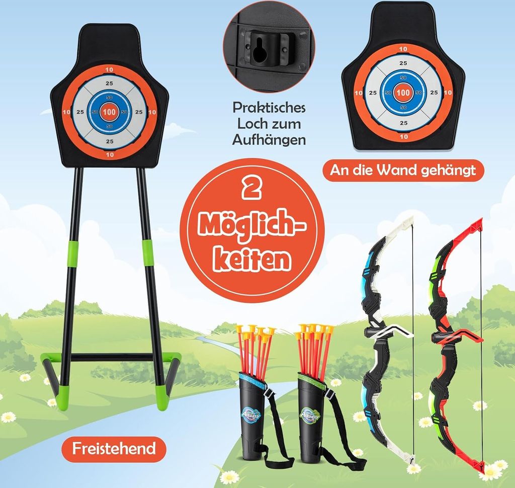 Abenteuer wartet! Dieses mega Pfeil-und-Bogen-Set begeistert kleine Abenteurer von 6-12 Jahren. Mit coolen LED-Leuchten am Bogen - wenn's dunkel wird, geht der Spaß erst richtig los! Enthalten: Bogen mit LED (Batterien nicht dabei), 10 Saugnapfpfeile, Zielscheibe und praktischer Köcher. Aus hochwertigem ABS-Material - sicher und langlebig. Die Saugnapfpfeile sind ungefährlich für Möbel und Wände - spielen drinnen und draußen ist kein Problem. Perfekt für Geburtstage, Familienfeiern oder einfach zum Toben im Garten. Fördert spielerisch Hand-Auge-Koordination und Konzentration. Im stylischen Verpackungsdesign - ideal als Geschenk! Ob für kleine Robin Hoods oder moderne Bogenschützinnen - hier kommt garantiert keine Langeweile auf. Hol dir das Action-Set und lass die Pfeile fliegen!