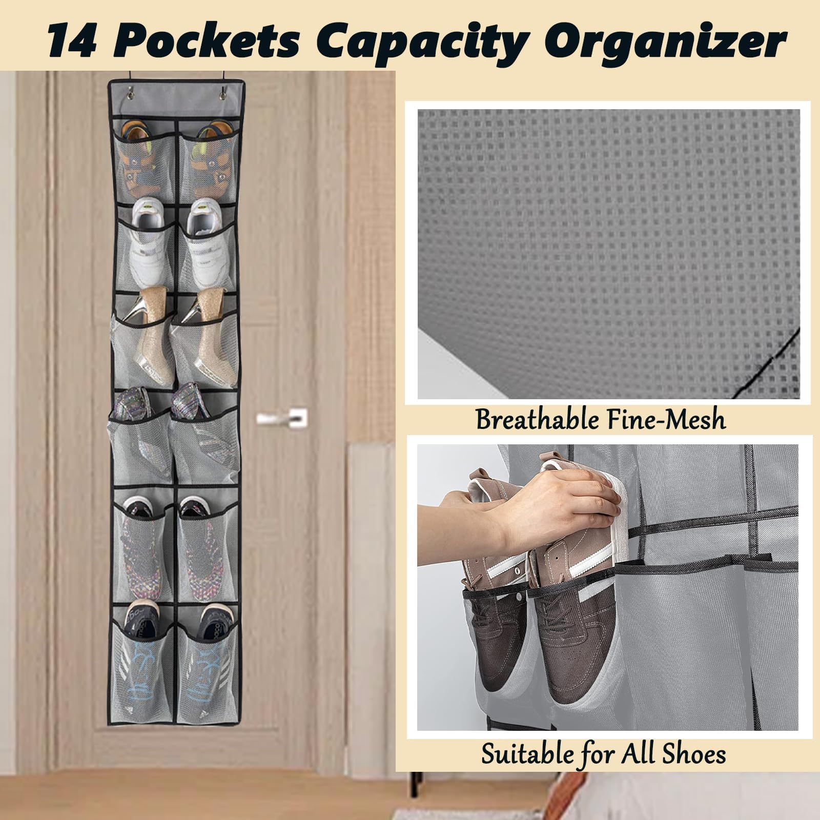 Platzprobleme? Dieser Tür-Organizer ist die Lösung! Mit 14 großen Taschen (96x43cm) hast du endlich Ordnung für deine Schuhe. Aber das ist noch nicht alles - du kannst da auch Handschuhe, Schals, Mützen oder andere Kleinigkeiten reinpacken. Aus robustem Oxford-Stoff (600D) - viel stabiler als diese billigen Netz-Organizer! Drei Haken sind abnehmbar, drei fest - so passt es an fast jede Tür, Wand oder Schrankstange. Super fürs Schlafzimmer, Bad, Kinderzimmer oder sogar im Wohnmobil. Einfach aufhängen und sofort mehr Ordnung haben! Das offene Design macht es einfach, alles schnell zu finden. Nie wieder suchen - alles hat seinen Platz!