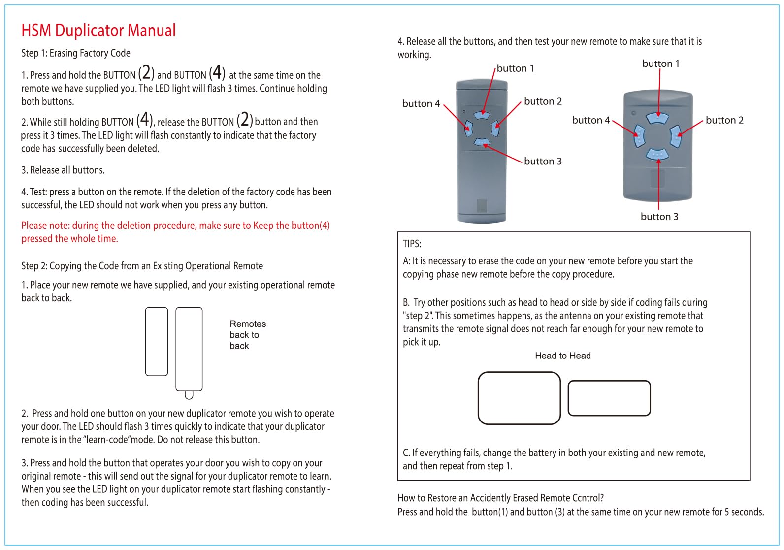 Verloren oder kaputt? Diese Universal-Fernbedienung ist die perfekte Ersatzlösung für deinen Hörmann Garagentoröffner! Läuft auf 868MHz und ist kompatibel mit fast allen Hörmann-Modellen: HSM2, HSM4, HS1, HS2, HS4, HSE2, HSZ1, HSZ2, HSP4 und mehr. WICHTIG: Du brauchst eine funktionierende Original-Fernbedienung zum Klonen! Einfach Face-to-Face kopieren und schon geht's. Mit 4 Tasten, Metall-ABS-Gehäuse und Reichweite bis 150m. Achtung: Nicht kompatibel mit BS-Serien oder anderen Frequenzen. Immer praktisch, wenn mal wieder eine Fernbedienung abhanden kommt! 🔑 Kompatibel mit Hörmann 868MHz Modellen 🔑 Einfaches Face-to-Face-Klonen 🔑 4 Tasten für verschiedene Funktionen 🔑 Bis zu 150m Reichweite 🔑 Robustes Metall-ABS-Gehäuse