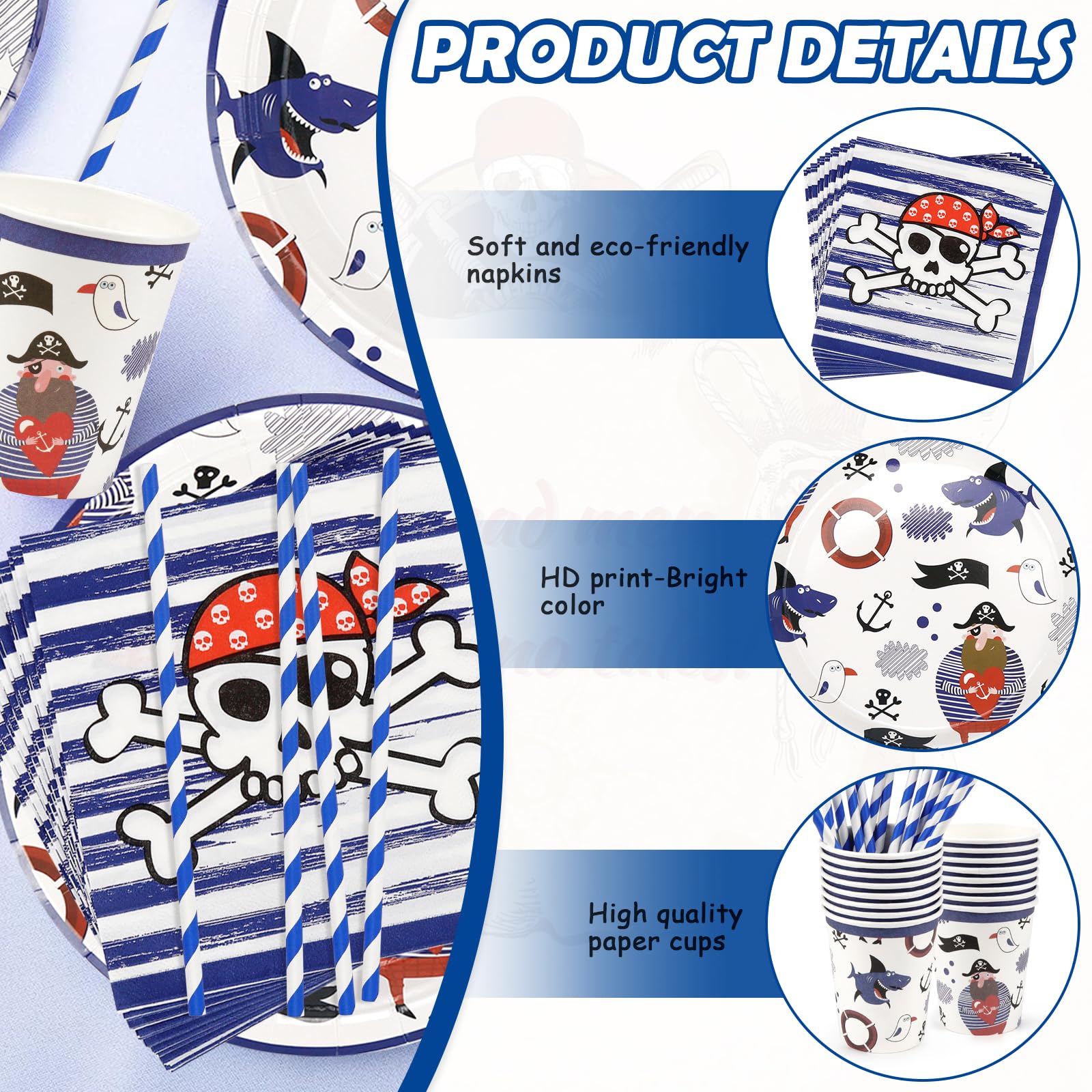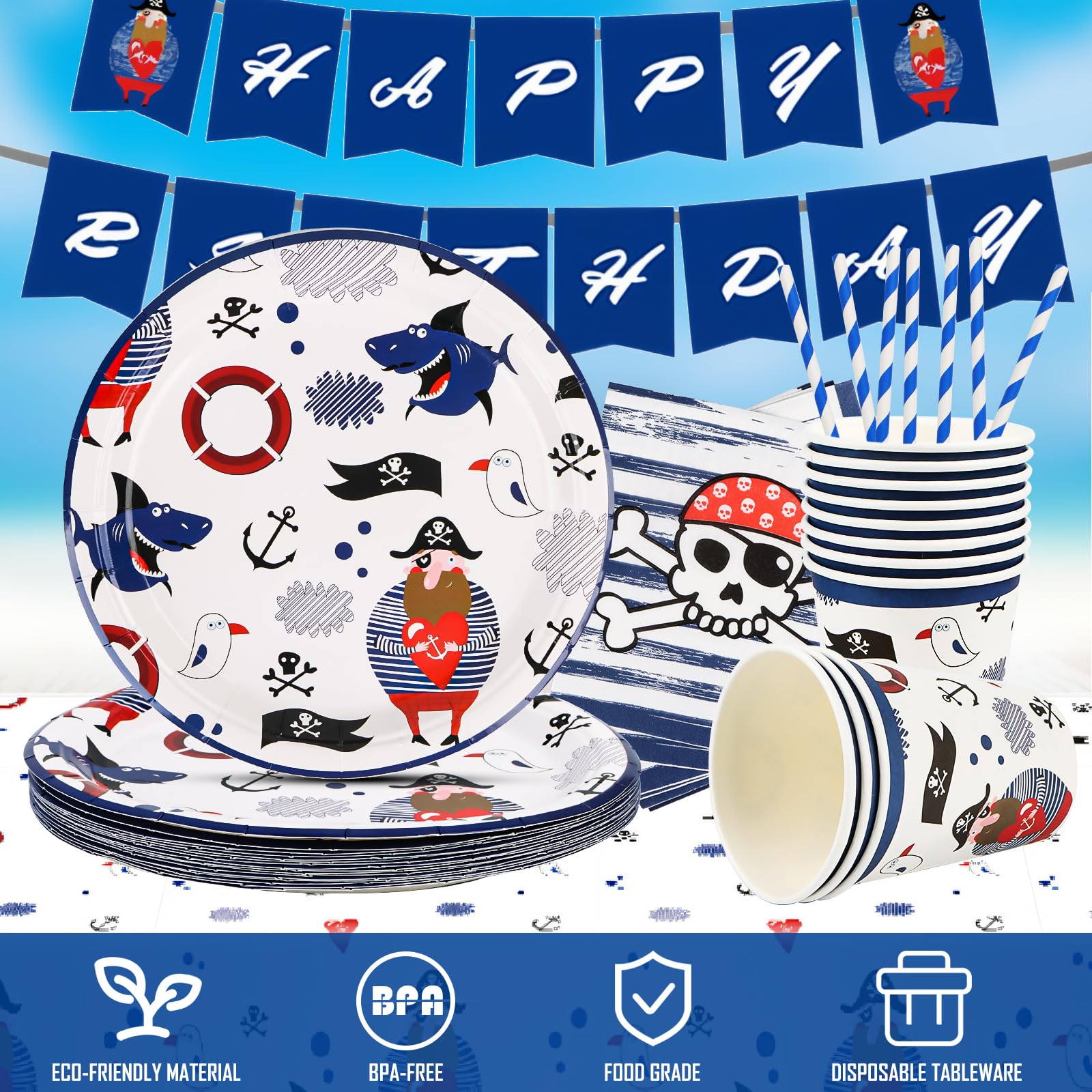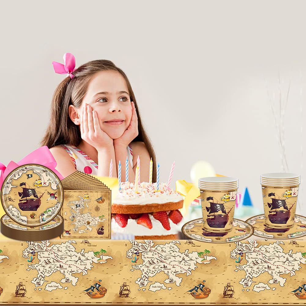 Ahoy, Kapitän! Mach den nächsten Kindergeburtstag zu einem echten Piraten-Abenteuer mit diesem komplettem Party-Set. Alles ist dabei was du brauchst: 20 coole Piraten-Pappteller, 20 Servietten, 10 Becher, 10 Strohhalme und sogar eine Tischdecke!