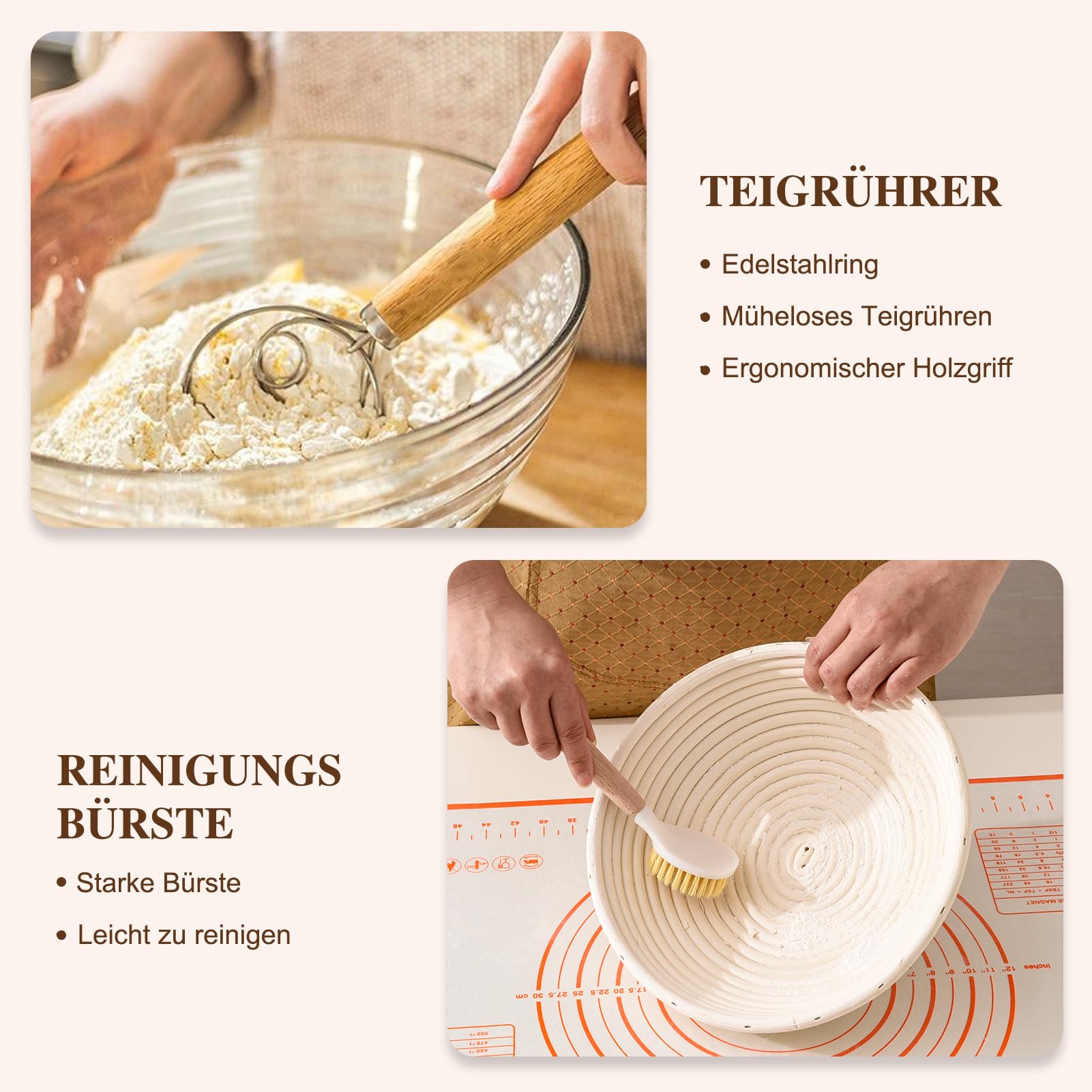 Mann, wenn du Bock hast richtig gutes Brot selbst zu backen, ist dieses Sauerteig-Set genau das Richtige! Alles was du brauchst ist in der 12-teiligen Box dabei. \\n\\nWas alles im Set enthalten ist: \\n• 1 runder Gärkorb (9 Zoll) aus Silikon \\n• 1 ovaler Gärkorb (10 Zoll) aus Silikon \\n• Sauerteig-Glas mit 34 oz Fassungsvermögen \\n• Silikon Spatel und Teigschneider \\n• Sauerteig-Schläger \\n• Rezeptbuch für Anfänger \\n• Brotschneidemaschine mit 5 Klingen \\n• Ölpinsel und Mehlsieb \\n\\nDas Sauerteig-Glas ist besonders clever: \\n• Temperatur-Regulierungsstreifen \\n• Fütterungszeit-Anzeige \\n• Füllstand-Markierung \\n• Atmungsaktiver Stoffdeckel + luftdichter Deckel \\n\\nDie Gärkörbe aus Silikon sind der Hammer: \\n• Antihaft - Teig löst sich leicht \\n• Hitze beständig - geht direkt in den Ofen \\n• Faltbar - platzsparend verstorbar \\n• Einfach zu reinigen \\n\\nMit dem 34 oz Glas kannst du bis zu 4-5 Brote gleichzeitig machen! Die Temperatur-Etiketten helfen dir, die ideale Gärtemperatur (24-29°C) im Blick zu behalten. \\n\\nPerfekt für: \\n• Brotback-Anfänger \\n• Erfahrene Bäcker \\n• Als Geschenk für Hobby-Bäcker \\n• Familien die gemeinsam backen wollen \\n\\nDas Rezeptbuch macht den Einstieg super einfach - da kann eigentlich nichts schiefgehen! \\n\\nAlso wenn du Lust auf frisches, selbstgemachtes Brot hast: Dieses Set hat alles was du brauchst - von der Starter-Zucht bis zum geschnittenen Brot!