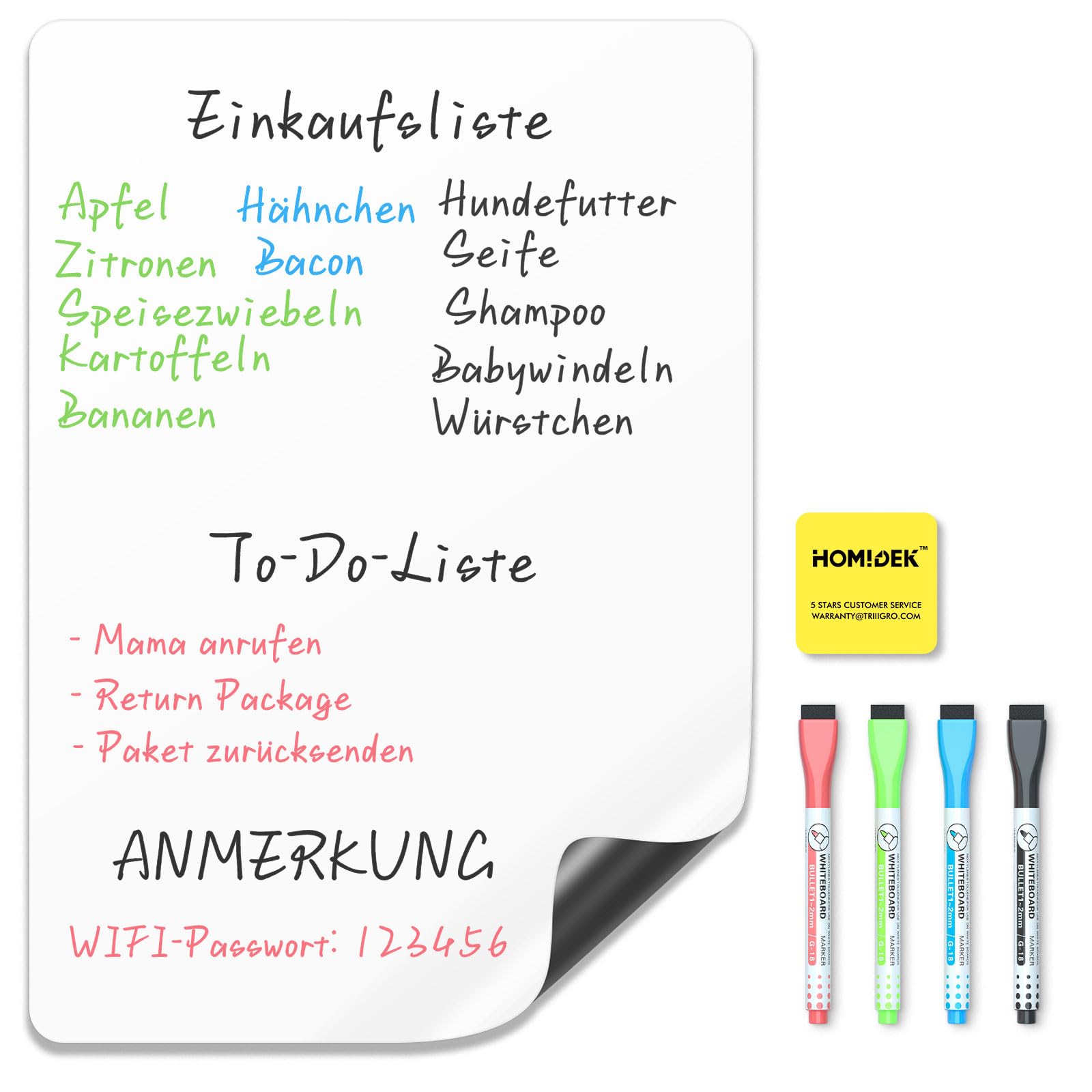 Verwandle deinen Kühlschrank in eine praktische Notizzentrale! Diese magnetische Whiteboard-Folie haftet super an jeder metallischen Oberfläche. Komplettset mit 5 abwischbaren Markern und magnetischem Schwamm. Perfekt für Einkaufslisten, Termine oder Nachrichten an die Familie. Die 0,52cm dicke Folie ist vollmagnetisch und hält bombenfest. Einfach aufkleben, beschreiben, abwischen - und immer wieder neu verwenden. Übrigens: Bitte vorher testen, ob dein Kühlschrank magnetisch ist (nicht alle Edelstahlmodelle sind es). So organisiert man heute!