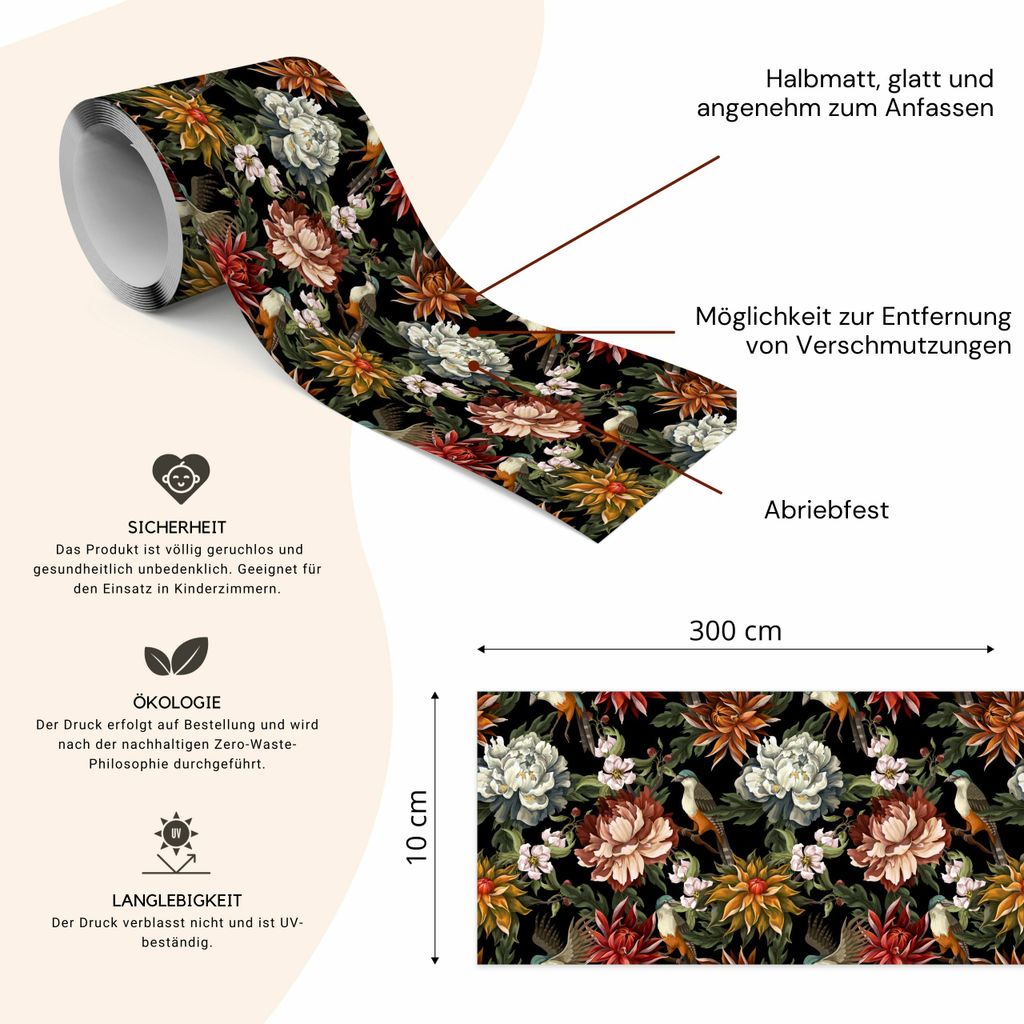 Blütenzauber für deine Wände! Diese selbstklebende Tapetenbordüre von Anna Wand mit prächtigen Pfingstrosen im Vintage-Design verwandelt jeden Raum. Länge: 450cm, Höhe: 11,5cm. Einfach anzubringen - auch auf Raufaser. Hergestellt in Deutschland aus lösemittelfreiem Tapetenvlies, ohne PVC und Weichmacher. Für Wohnzimmer, Schlafzimmer, Küche oder Flur. Einfach Trägerpapier abziehen und positionieren. Made in Germany mit viel Liebe zum Detail. Verschönere deine vier Wände im Handumdrehen - Wohlfühlatmosphäre garantiert!