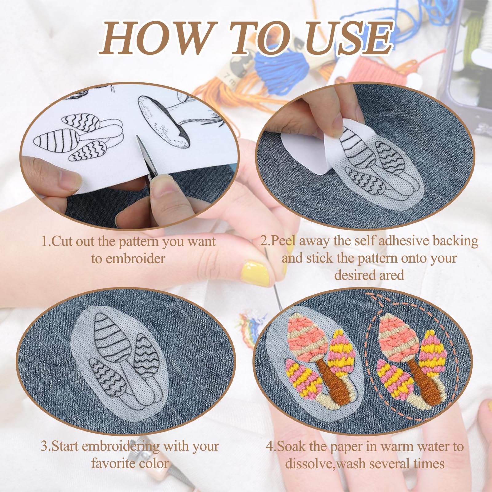 Total praktisch für Stick-Fans! Dieses Set von FUGLUS hat 4 A4 Blätter mit 118 verschiedenen Motiven - von Blumen über Vögel bis Schmetterlinge. Das wasserlösliche Vlies klebt von selbst auf dem Stoff und löst sich nach dem Sticken einfach in Wasser auf. Super easy für Anfänger und Profis! Einfach Motiv ausschneiden, aufkleben, sticken und dann abspülen. Perfekt für Kleidung, Kissen, Taschen oder Geschenke. Mach deine Textilien zu Unikaten ohne lästiges Abpausen. Der Kreativität sind keine Grenzen gesetzt!