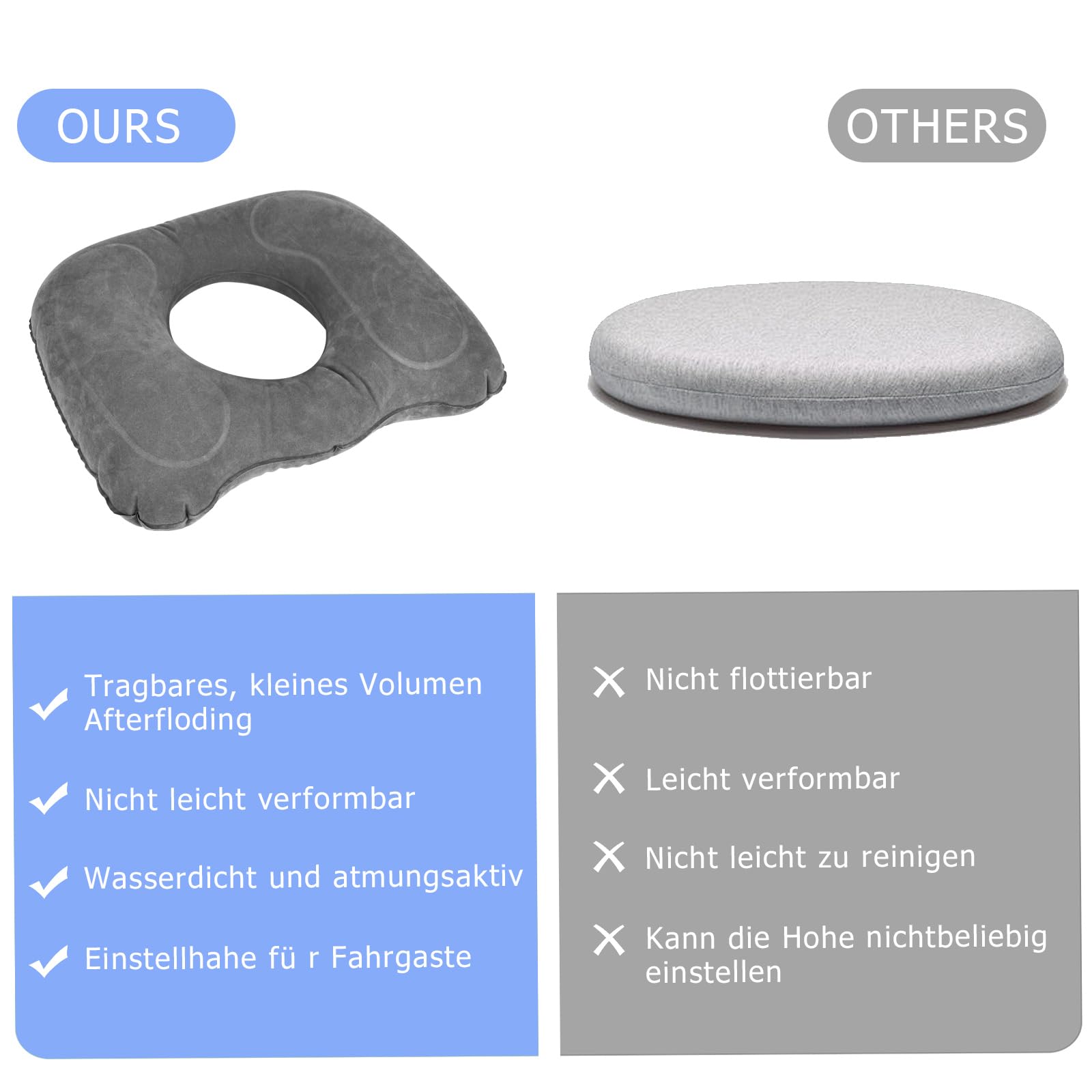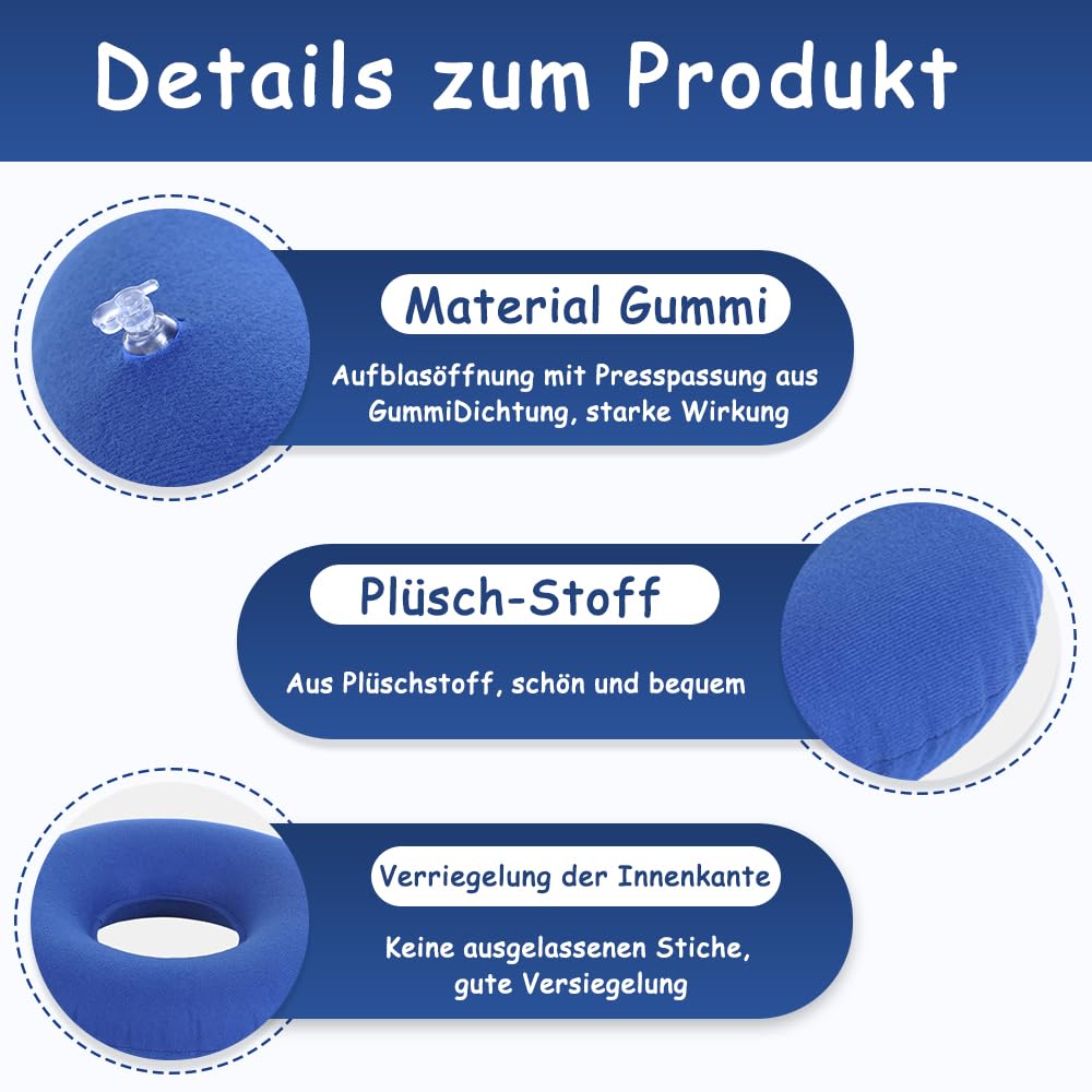 Dieser aufblasbare Sitzring ist die Rettung für alle, die viel sitzen müssen! Ob im Büro, Auto oder Rollstuhl - das ringförmige Design entlastet gezielt dein Steißbein und verbessert deine Sitzhaltung. Super praktisch: Du brauchst keine Pumpe! Einfach durch das Druckknopf-Ventil aufblasen und in 60 Sekunden ist das Kissen einsatzbereit. Durch die variable Füllmenge kannst du die Härte genau an deine Bedürfnisse anpassen. Aber das Beste: Wenn du nicht sitzt, lässt sich der Sitzring komplett entleeren und auf Handgröße zusammenfalten! Perfekt also für unterwegs, im Urlaub oder für die Arbeit. Passt in jede Tasche oder Schublade. Die schmutzabweisende Oberfläche ist super leicht zu reinigen - einfach mit einem feuchten Tuch abwischen. Nicht nur als Sitzkissen geeignet: Du kannst ihn auch als Nackenstütze oder Beinauflage verwenden. Ideal nach Operationen, in der Schwangerschaft oder bei chronischen Rückenproblemen. Dein Rücken wird dir danken!
