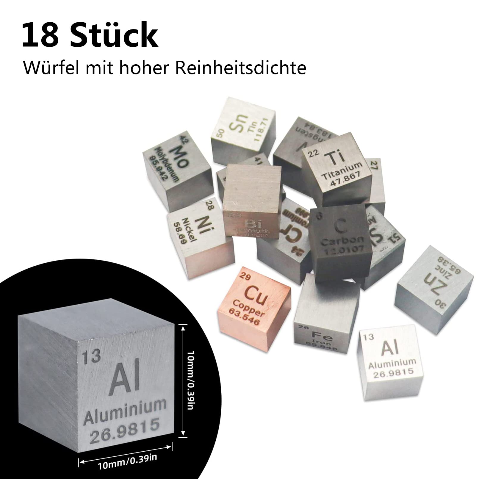 Für Chemie-Begeisterte und Sammler! Diese hochglanzpolierten Metallwürfel machen das Periodensystem greifbar. Jeder Würfel ist 10x10x10mm groß und besteht aus reinem Metall wie Wolfram, Kohlenstoff, Nickel und Kupfer mit bis zu 99,99% Reinheit. Die lasermarkierten Infos zeigen Atomnummer, Symbol, Name und Dichte. Perfekt für den Chemieunterricht, Labor oder als besondere Deko. Jeder Würfel kommt in einer schützenden Acrylbox - ideal zur Aufbewahrung und Präsentation. Ein faszinierendes Geschenk für Schüler, Studenten oder alle, die sich für Wissenschaft begeistern. Achtung: Am besten mit Handschuhen anfassen und trocken lagern!