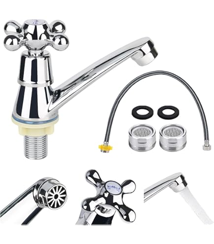 Einfach und praktisch - dieser Single Kaltwasserhahn fürs Bad macht alles mit! Aus hochwertiger Zinklegierung in silber, mit hübschem Plum Blossom Griff. Inklusive 60cm Schlauch, 2 Adaptern und Dichtungen. Der ABS-Kunststoff-Filter verhindert Spritzer und spart Wasser. Einfach zu installieren ohne Bohren - einfach anschrauben und fertig. Perfekt für Waschbecken, Küche, Waschküche oder sogar Wohnmobile. Modernes Design passt in jedes Badezimmer. Robust und langlebig, dabei super funktional. Mach dein Waschbecken komplett - mit dieser unkomplizierten Armatur!