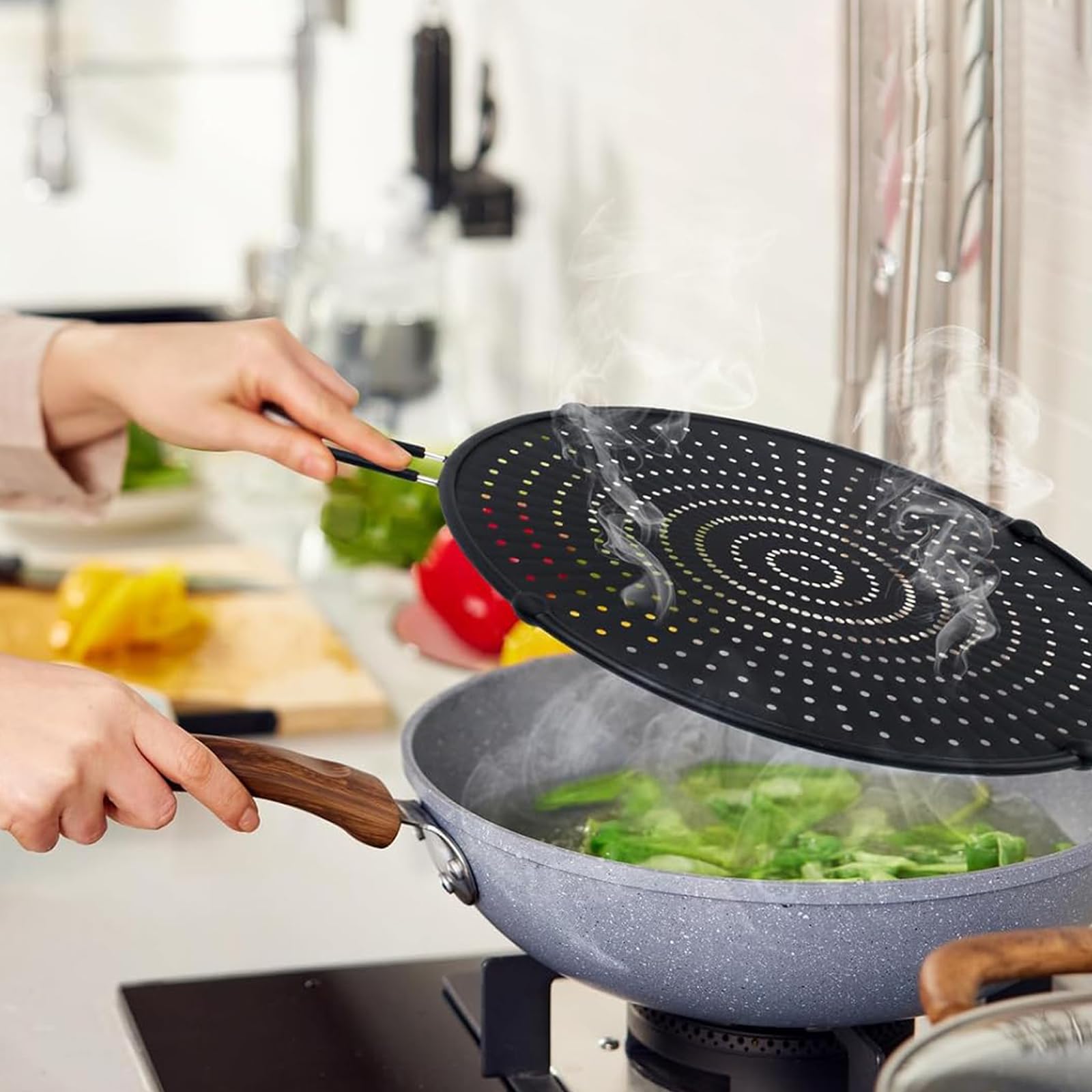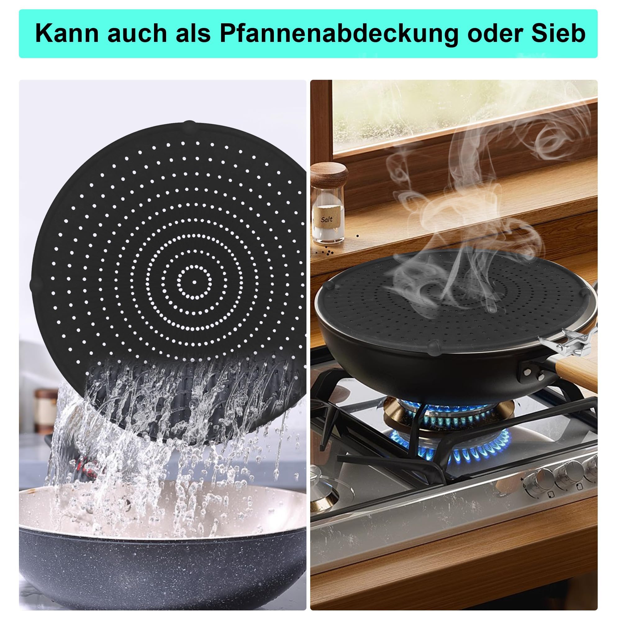 Mann, dieser Spritzschutz ist ein echter Game-Changer in der Küche! Stell dir vor: Du brätst was an und es spritzt kein Fett mehr auf die Arbeitsfläche oder deine Kleidung - wie genial ist das denn?\\n\\nDas Teil ist aus hochwertigem, lebensmittelechtem Silikon und hält Temperaturen bis zu 230°C stand. Der Edelstahl-Griff liegt super in der Hand und wird nicht heiß, dank der Silikon-Ummantelung.\\n\\nMit 44x32 cm passt der Spritzschutz auf die meisten Pfannen und Töpfe bis 32 cm Durchmesser. Das poröse Design lässt den Dampf raus, aber kein Fett - so bleibt dein Essen knusprig und deine Küche sauber.\\n\\nWas ich noch mega finde: Du kannst den Spritzschutz auch als Sieb, Pfannendeckel oder sogar als Kühlunterlage verwenden. Die erhöhten Füße sorgen dafür, dass er nicht auf der Arbeitsfläche klebt.\\n\\nReinigen ist super einfach - einfach abspülen oder in die Spülmaschine stecken. Und mit dem Aufhänger kannst du ihn platzsparend verstauen. Also, wenn du keine Lust mehr auf lästiges Putzen nach dem Kochen hast - hier ist deine Lösung! Deine Küche und deine Klamotten werden's dir danken.