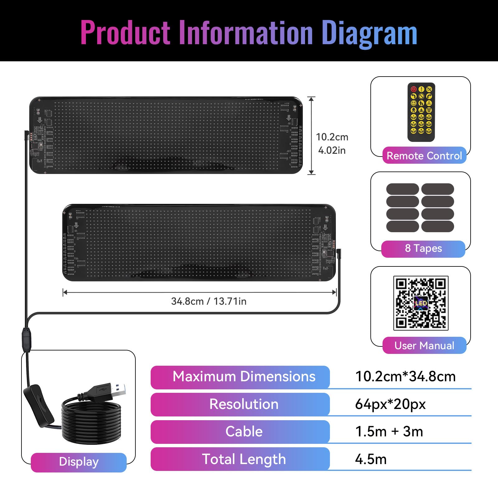 Willst du dein Auto richtig aufpeppen? Diese LED Teufelaugen machen deine Scheibe zur Leinwand! Mit 12x60 cm Größe und 1536 Pixeln ist das Display richtig hell und hochauflösend. Per Bluetooth-App oder Fernbedienung kannst du Texte, Grafiken oder coole Animationen einstellen - deiner Kreativität sind keine Grenzen gesetzt! Über 100 vorgefertigte Designs stehen zur Auswahl, oder du erstellst deine eigenen Motive. Wasserdicht und flexibel passt es sich jeder Scheibe an. Einfach per USB mit 5V betreiben und schon kann's losgehen. Ob für Autotuning, Werbung oder Partys - mit diesen Teufelaugen wirst du garantiert Aufsehen erregen. Tagsüber und nachts gut sichtbar - einfach mega cool!