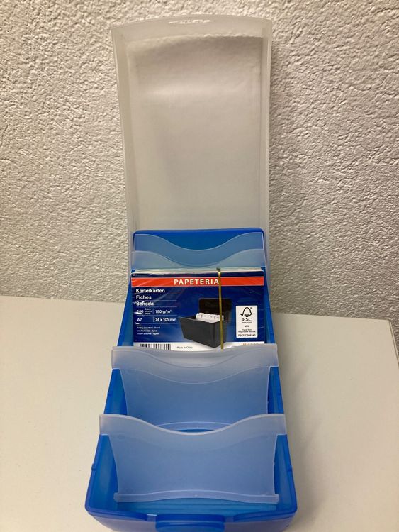 Hey, für alle die lernen müssen: Diese Karteibox ist echt genial! Kommt schon mit 100 Karteikarten im Format A8 (5,2x7,4 cm) und hat Platz für insgesamt 600 Stück. Mit den 4 Trennwänden kannst du das 5-Fächer-Lernsystem perfekt umsetzen.