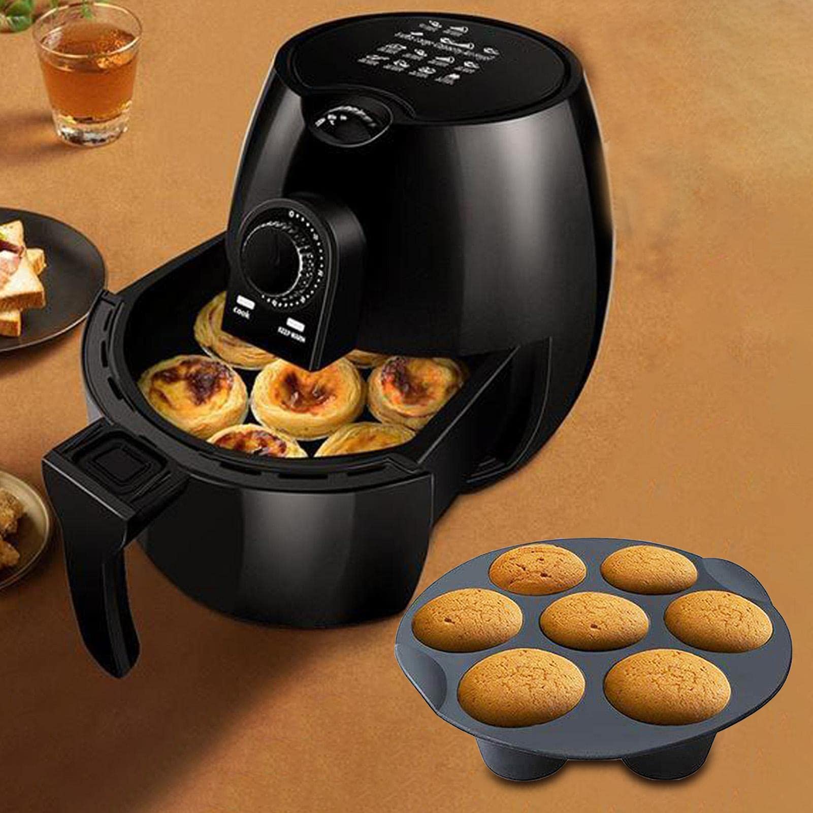Perfekte Muffins aus der Luftfritteuse! Diese praktische Silikon-Backform mit 7 Mulden ist speziell für Luftfritteusen entwickelt. Erhältlich in drei Größen: 16cm für 2,6-5,8l Geräte, 18cm für 3,2-5,8l und 21cm für 3,5-5,8l Luftfritteusen. Aus lebensmittelechtem Silikon - absolut antihaftbeschichtet und extrem temperaturbeständig von -40°C bis +230°C. Spülmaschinenfest und wiederverwendbar - einfach reinigen und immer wieder verwenden. Die flexible Silikon-Form ermöglicht leichtes Herauslösen der Muffins ohne Bruch. Ideal für Cupcakes, Muffins, kleine Kuchen oder sogar Schokoladenkreationen. Das einzigartige Design mit 7 Mulden bietet Abwechslung und passt sich verschiedenen Familienbedürfnissen an. Robust und langlebig - verformt sich nicht und behält seine Form. Mach deine Luftfritteuse zum vielseitigen Back-Profi! Einfach befüllen, in die Luftfritteuse stellen und dich über perfekte Backergebnisse freuen.