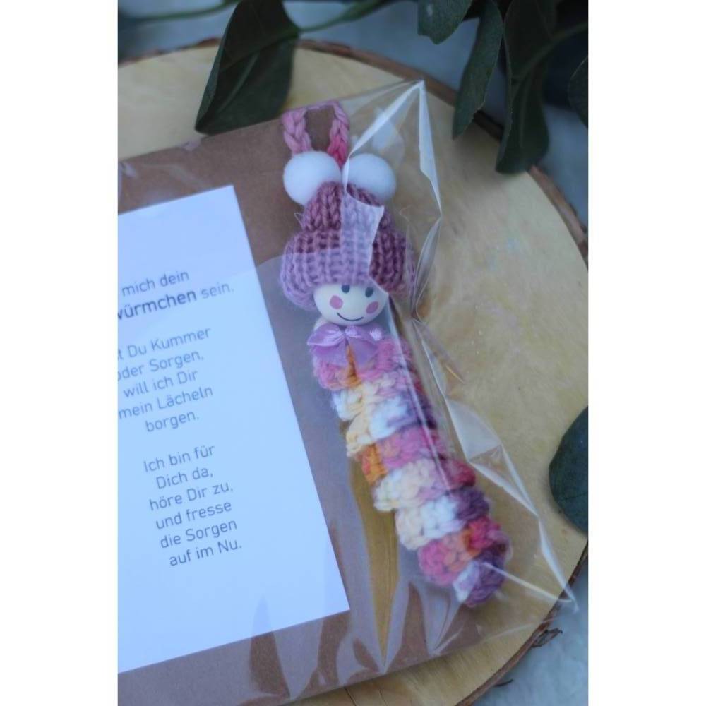 Oh wie süß! Dieses handgehäkelte Glückswürmchen mit Blumenköpfchen ist der perfekte Begleiter gegen Sorgen. Jedes Stück ist ein Unikat, liebevoll von Hand gefertigt. Aus hochwertiger Wolle gemacht - super weich und langlebig. Perfekt als kleiner Glücksbringer für die Tasche oder als Trostspender. Wird mit einem süßen Geschenkbeutel geliefert, ideal zum Verschenken. Ob zum Geburtstag, als Mitbringsel oder einfach so - bringt immer ein Lächeln ins Gesicht! Die Blume 'Rose' sieht total niedlich aus und die Farben sind einfach bezaubernd. Einfach in die Jacke hängen oder ans Handy klippen - überall dabei! Macht nicht nur Kindern Freude, sondern auch Erwachsenen. Ein kleines Stück Glück für den Alltag!