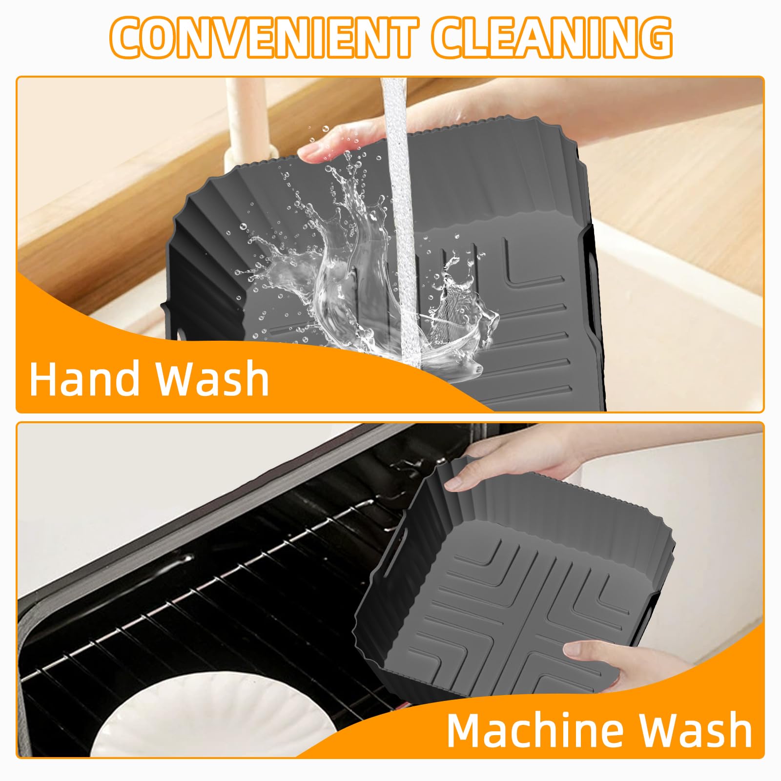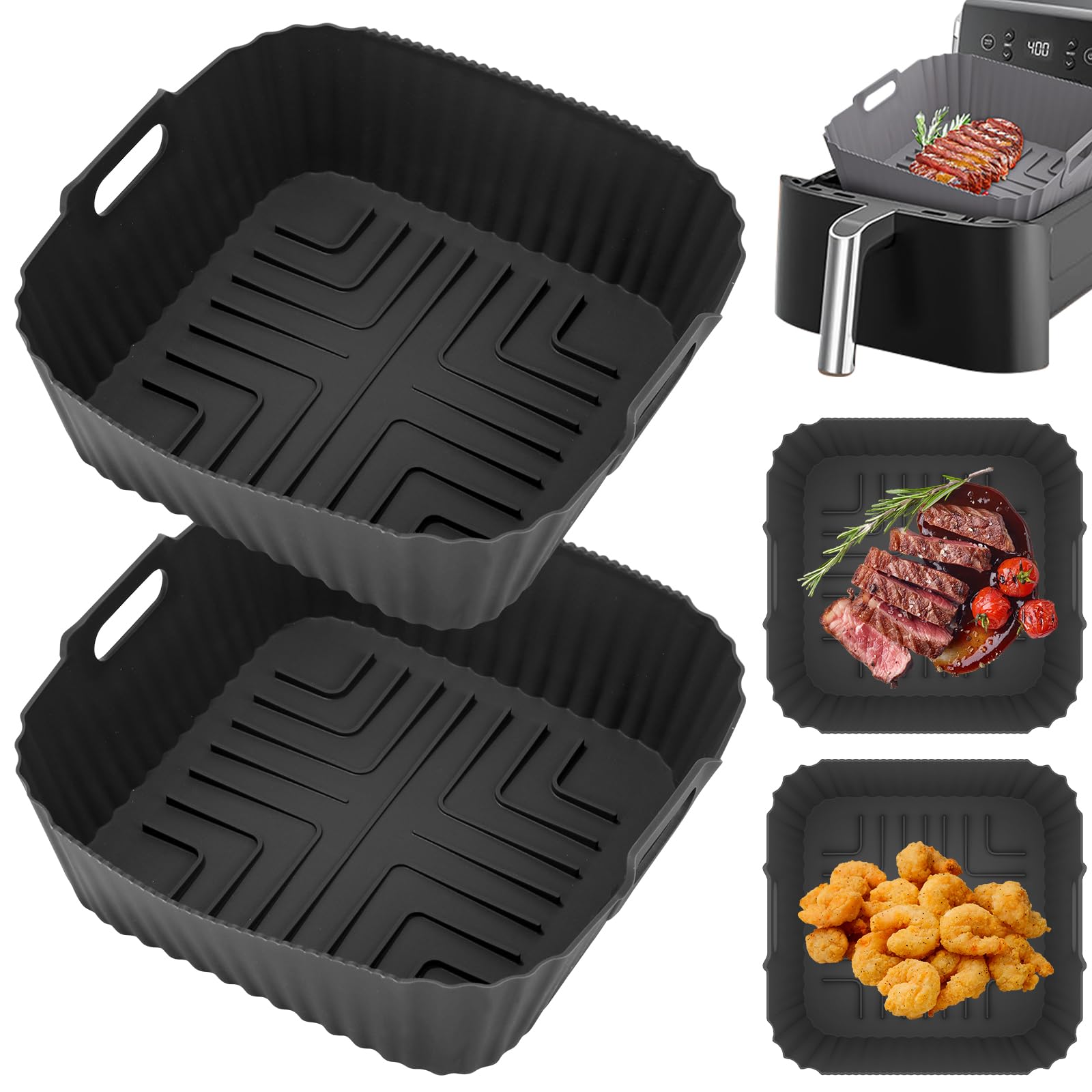 Die beiden Formsets (19x19x7cm und 23x23x7cm) passen perfekt in die meisten Heißluftfritteusen von 4,7L bis 6,2L - egal ob Ninja, Philips, Cosori oder andere Marken. Endlich kein lästiges Reinigen mehr vom Fritteusenkorb!