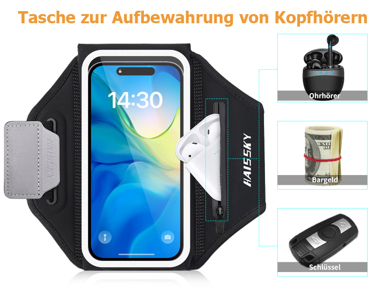 Perfekt für alle, die beim Sport ihr Smartphone griffbereit haben wollen! Dieses Sportarmband sitzt sicher am Oberarm und hat gleich zwei praktische Fächer: eins für deine Kopfhörer oder Schlüssel und ein verstecktes für Karten oder Bargeld. Das Beste? Durch die ultra-dünne Folie kannst du dein Smartphone bedienen, ohne es rauszunehmen - egal ob du Musik wechseln oder Nachrichten checken willst. Das Material ist angenehm leicht, atmungsaktiv und schweißresistent, sodass nichts verrutscht. Besonders praktisch für Dunkelheit: reflektierende Streifen sorgen für bessere Sichtbarkeit. Passt für iPhones der Serie 16/15/14/13 und Galaxy S24/S23/S22 Ultra sowie viele andere Modelle bis 6,9 Zoll. Am besten verwendest du eine schlanke Handyhülle, dann sitzt alles perfekt!