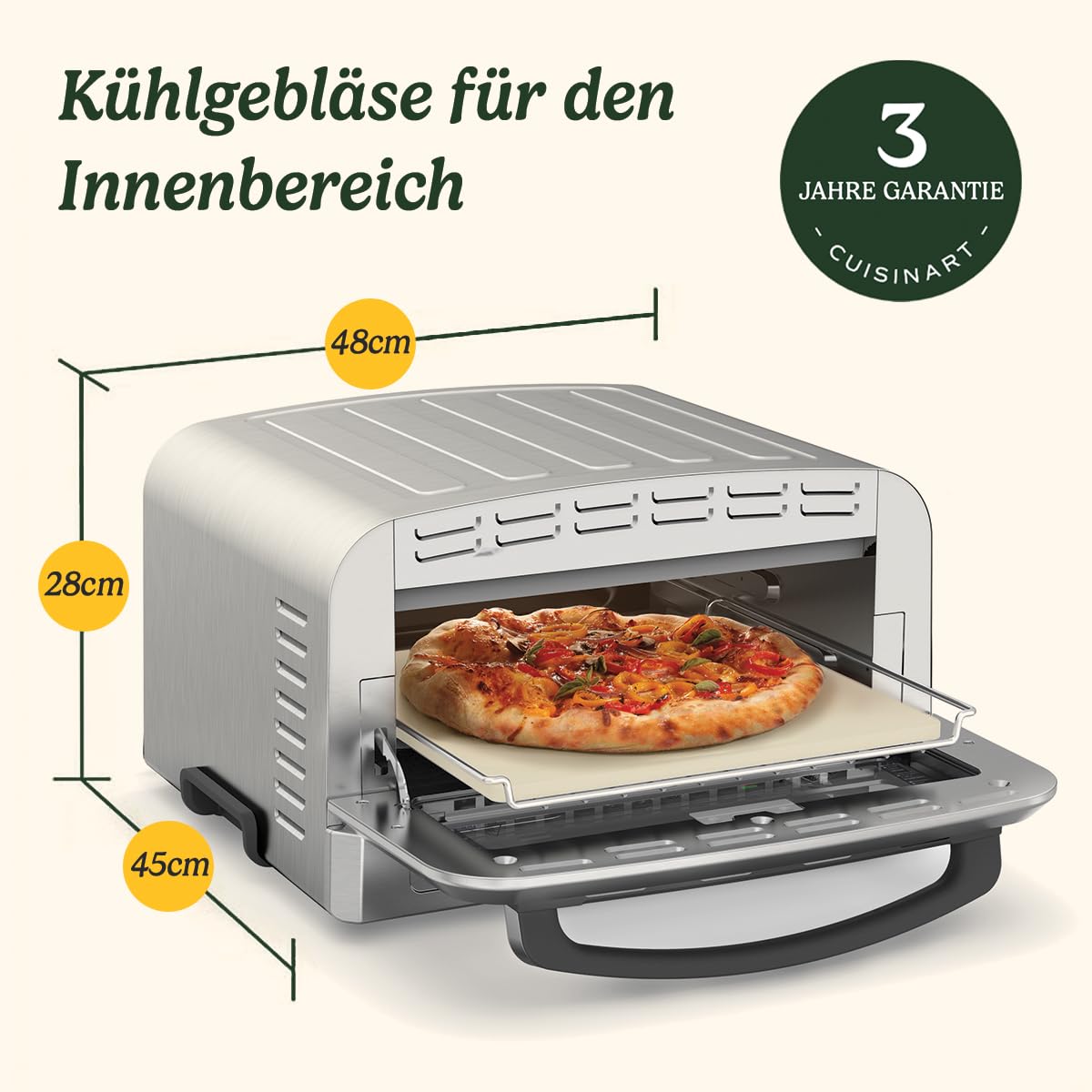 Wow, stell dir vor: Du kannst jetzt wie ein echter Pizzameister in deiner eigenen Küche arbeiten! Der Cuisinart Pizzaofen bringt den authentischen Holzofengeschmack direkt zu dir nach Hause - und das in nur 5 Minuten. Kein Warten mehr auf Lieferdienste, wenn die Lust auf knusprige Pizza kommt. \n\nDieser clevere Ofen wird bis zu 400°C heiß - viel heißer als dein normaler Backofen. Egal ob du neapolitanische Pizza mit weichem Teig magst, knusprige dünne Pizza, saftige Deep Pan oder sogar Focaccia und Calzone - hier wird alles perfekt. \n\nUnd das Beste: Das große Sichtfenster mit Beleuchtung lässt dich zuschauen, wie deine Pizza goldbraun wird. Mit dem praktischen Timer stellst du einfach Zeit und Temperatur ein und kannst dich zurücklehnen. \n\nIm Lieferumfang ist alles dabei, was du brauchst: \n• 12,5 Zoll Pizzastein für perfekte Kruste\n• Tiefe Backform für Specials\n• Klappbarer Pizzaschieber\n• Pizzaschneider\n• Rezeptbuch mit Inspirationen\n\nPerfekt für gemütliche Abende mit Freunden oder Familien-Pizza-Partys! Du kannst übrigens nicht nur Pizza machen - probier doch mal Pasta-Aufläufe, Gnocchi oder sogar süße Köstlichkeiten darin aus. Der Kreativität sind keine Grenzen gesetzt!