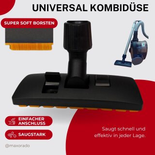 Hey, diese Bodendüse ist ja mal super für alle Hartböden! 32mm Anschluss - passt an AEG, Philips, Rowenta, Dirt Devil und viele mehr. Mit weichen Borsten und gummierten Rädern - schont Parkett, Laminat, Fliesen und Vinyl. 360° Drehgelenk - kommst super in jede Ecke und unter Möbel. Beeinträchtigt nicht die Saugleistung - reinigt gründlich und schonend. Einfach aufs Teleskoprohr stecken und loslegen. Perfekt als Ersatz für kaputte Originaldüsen - viel günstiger und genauso gut!